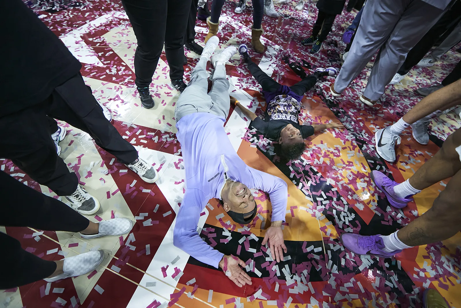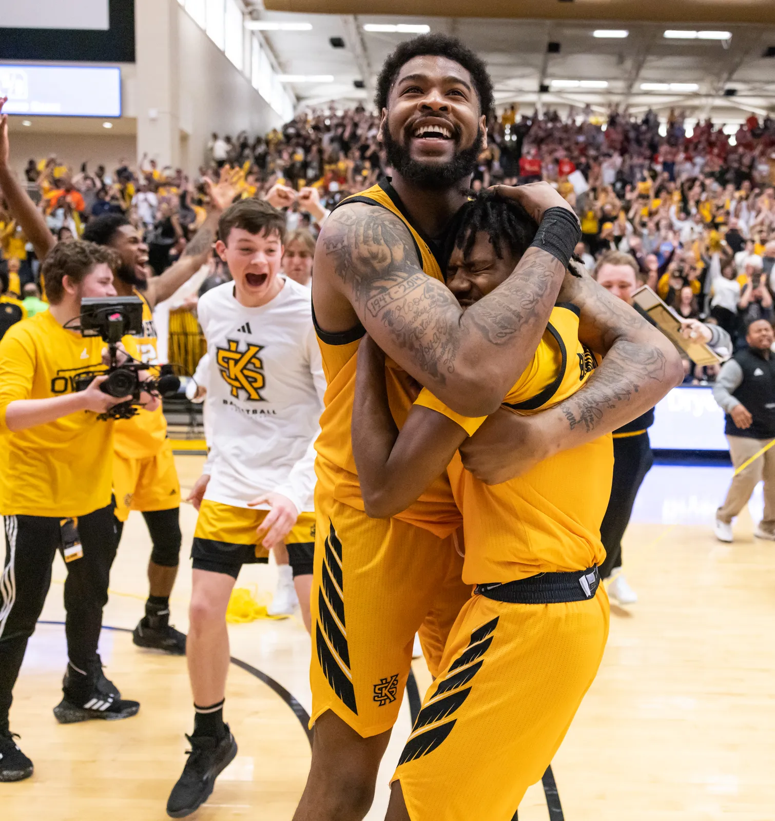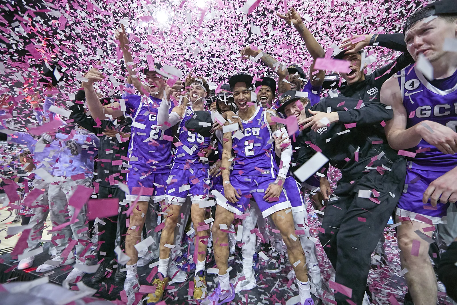 Men's basketball players celebrate winning the ASUN division and advancing them to March Madness for the first time in college history.