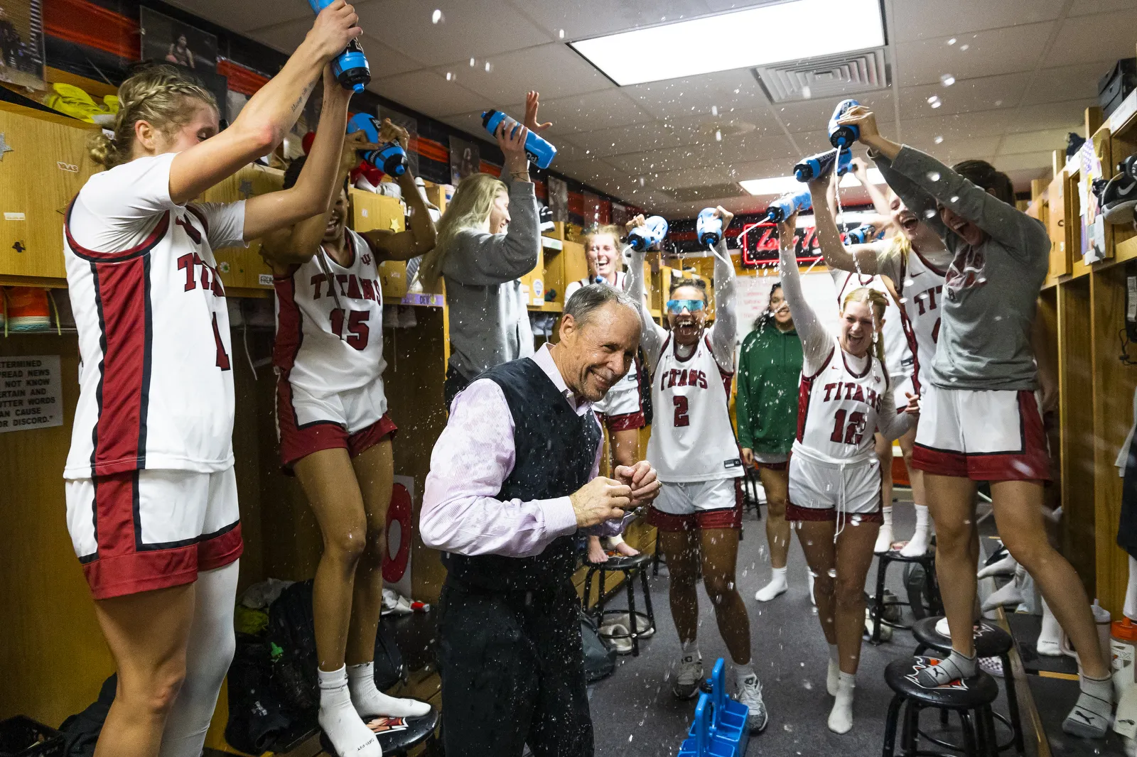 IUSB women’s basketball players douse head coach Steve Bruce with water after winning the Indiana University South Bend vs. Indiana University Northwest basketball game Wednesday Feb. 15, 2023 in the Student Activities Center on campus at IUSB.