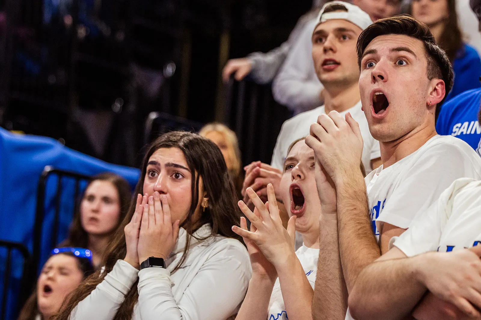 Fans in the student section react to a shocking turn of events during a basketball game on February 3, 2023.