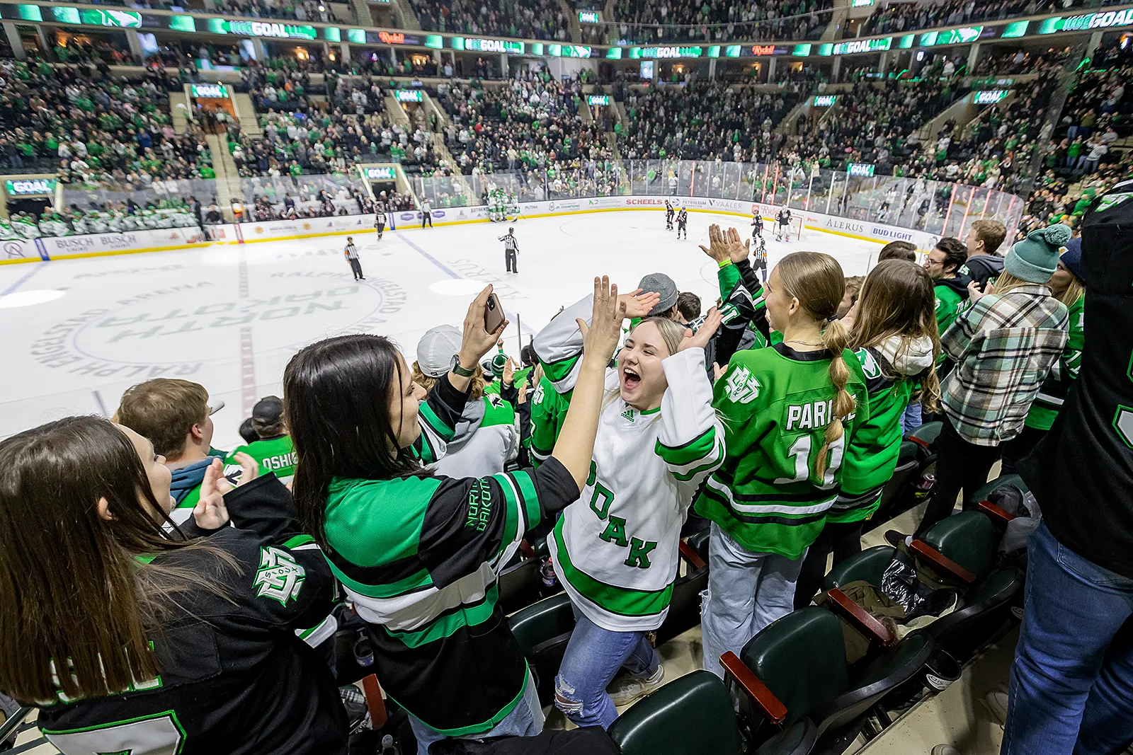 Students celebrate after a Fighting Hawks goal at Ralph Engelstad Arena.