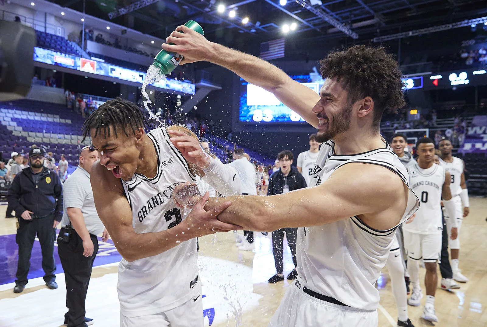 Grand Canyon guard Chance McMillian (2) is doused with water by teammate Gabe McGlothan following their 86-83 win over Stephen F. Austin .