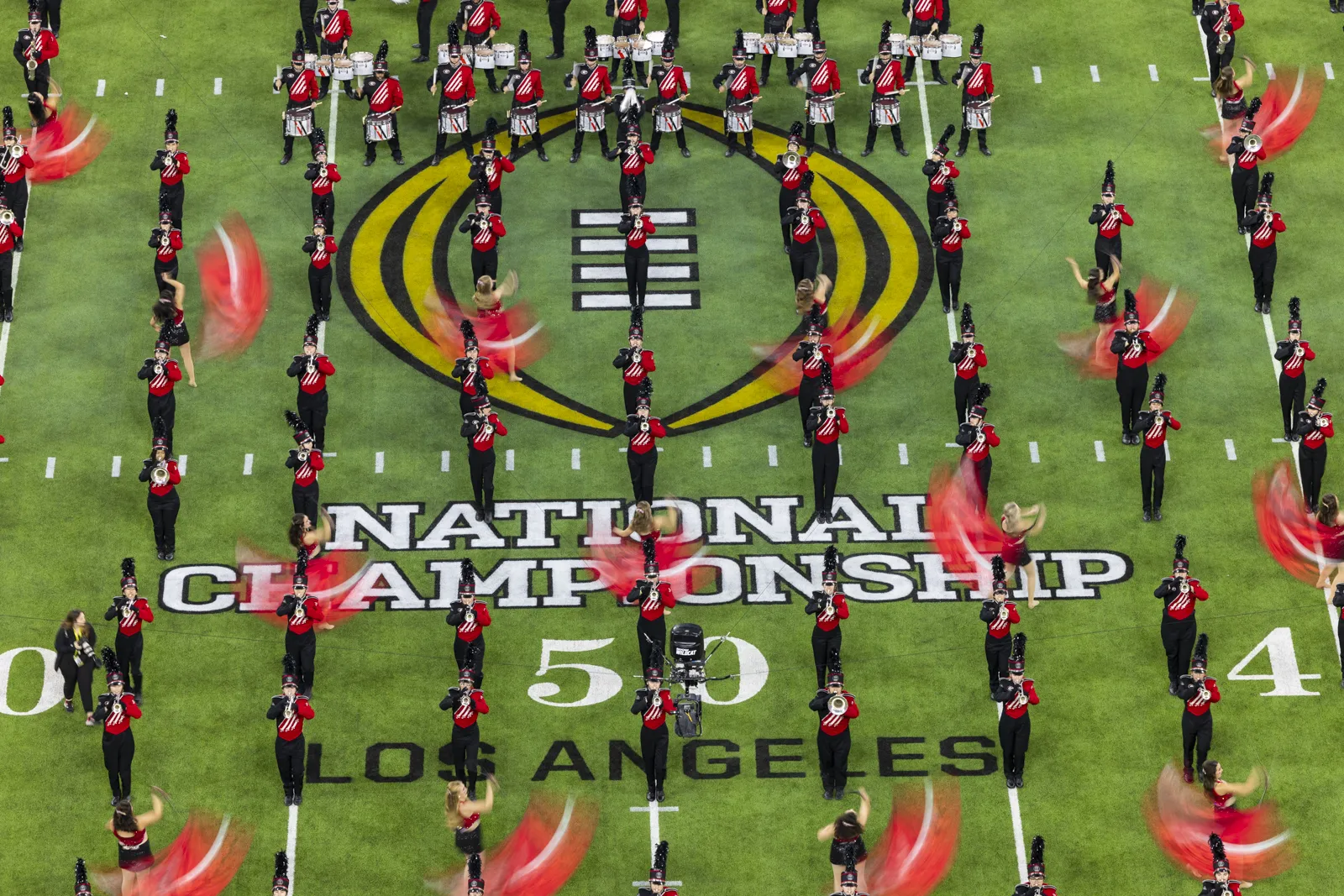 The University of Georgia Red Coat Marching Band performs at halftime of the National Championship game against TCU in Inglewood, California.