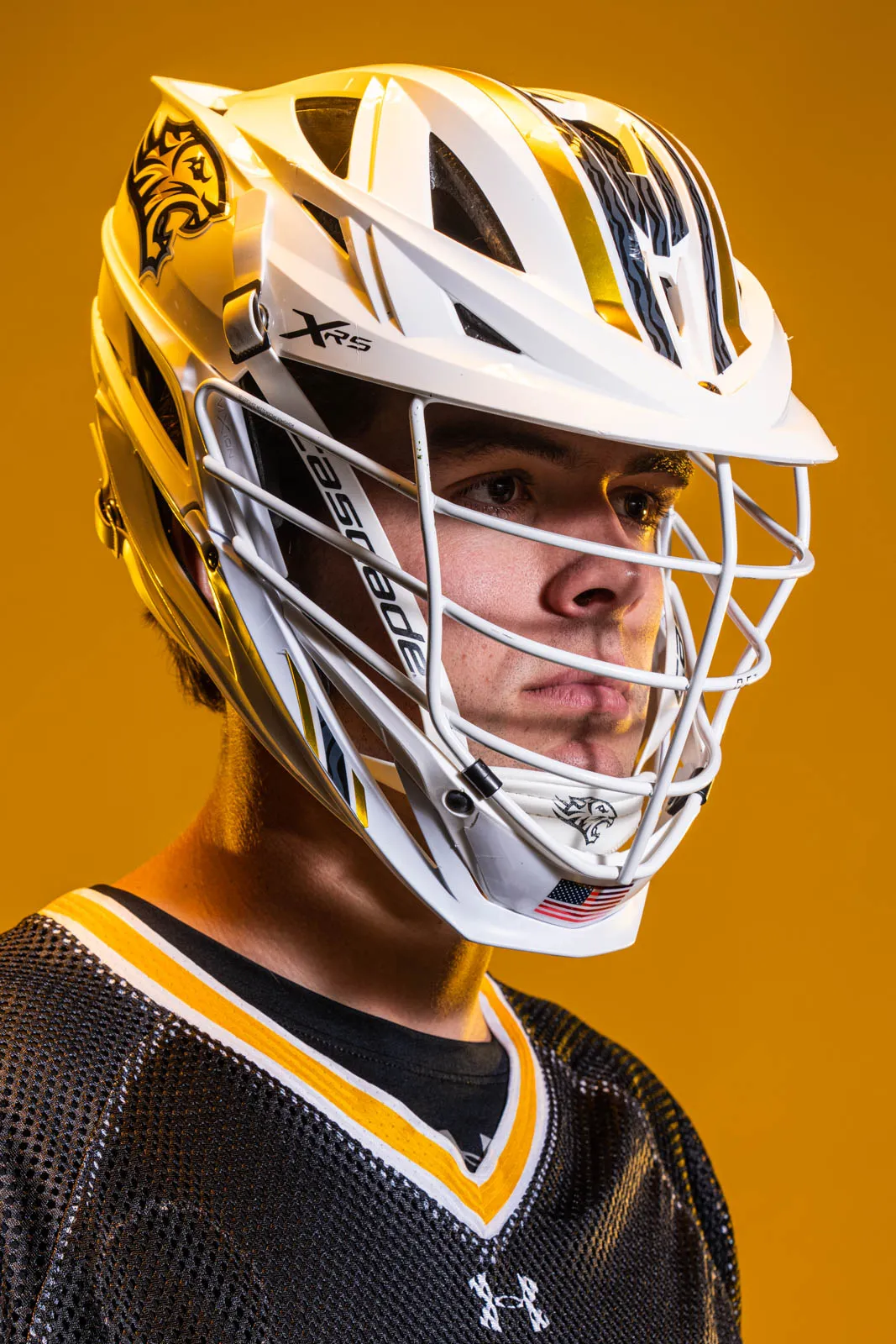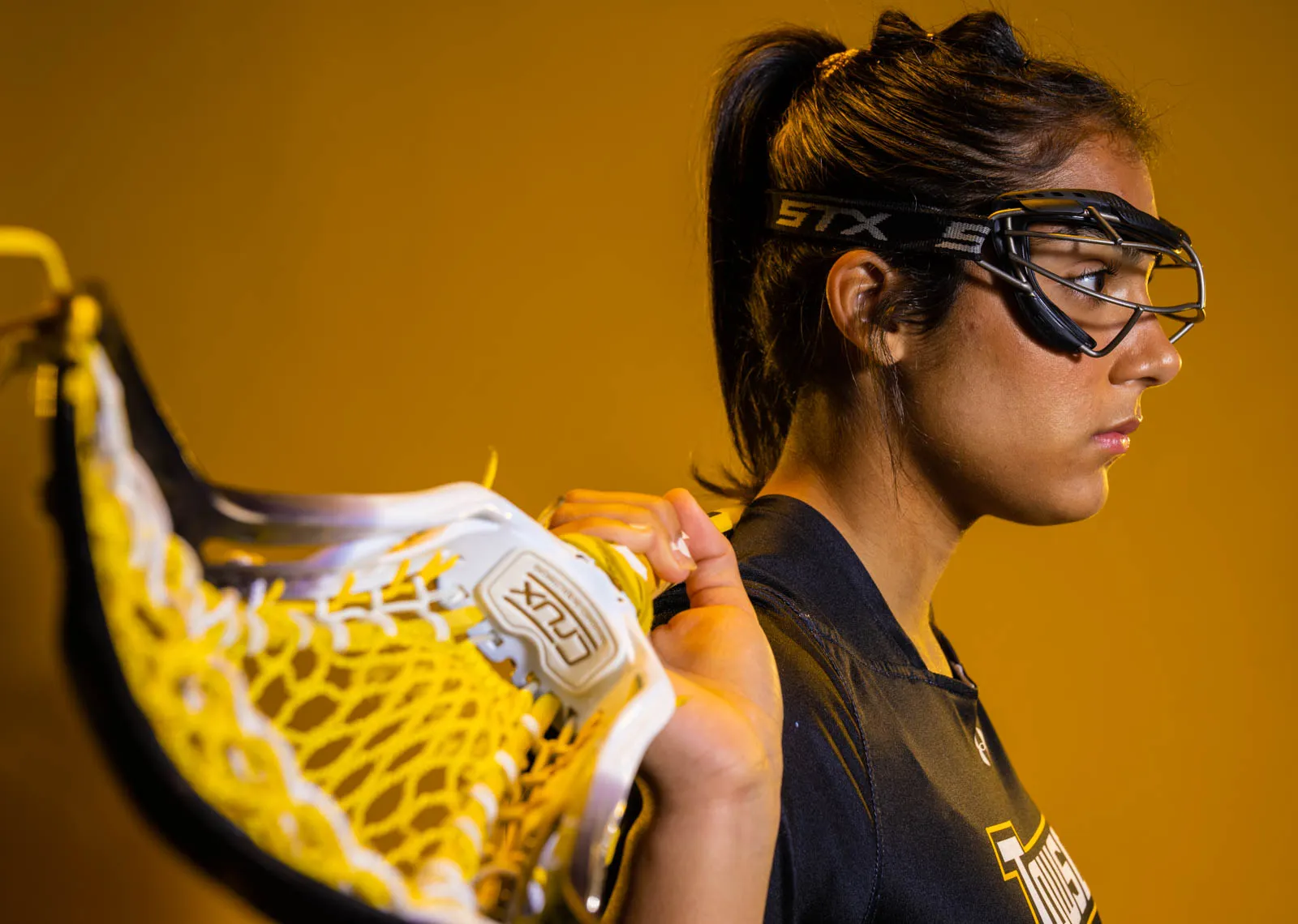 Women's Lacrosse player poses for portrait with stick and goggles.