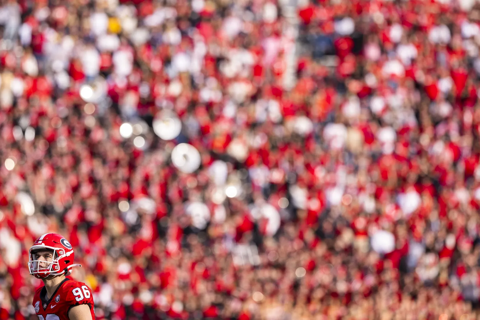 Georgia kicker Jack Podlesny (96) looks up before kicking a field goal during the final regular season game against Georgia Tech.