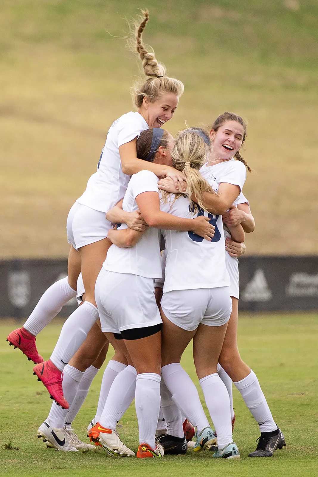 St. Edward's teammates celebrate a goal in their homecoming game against Texas Woman's University.