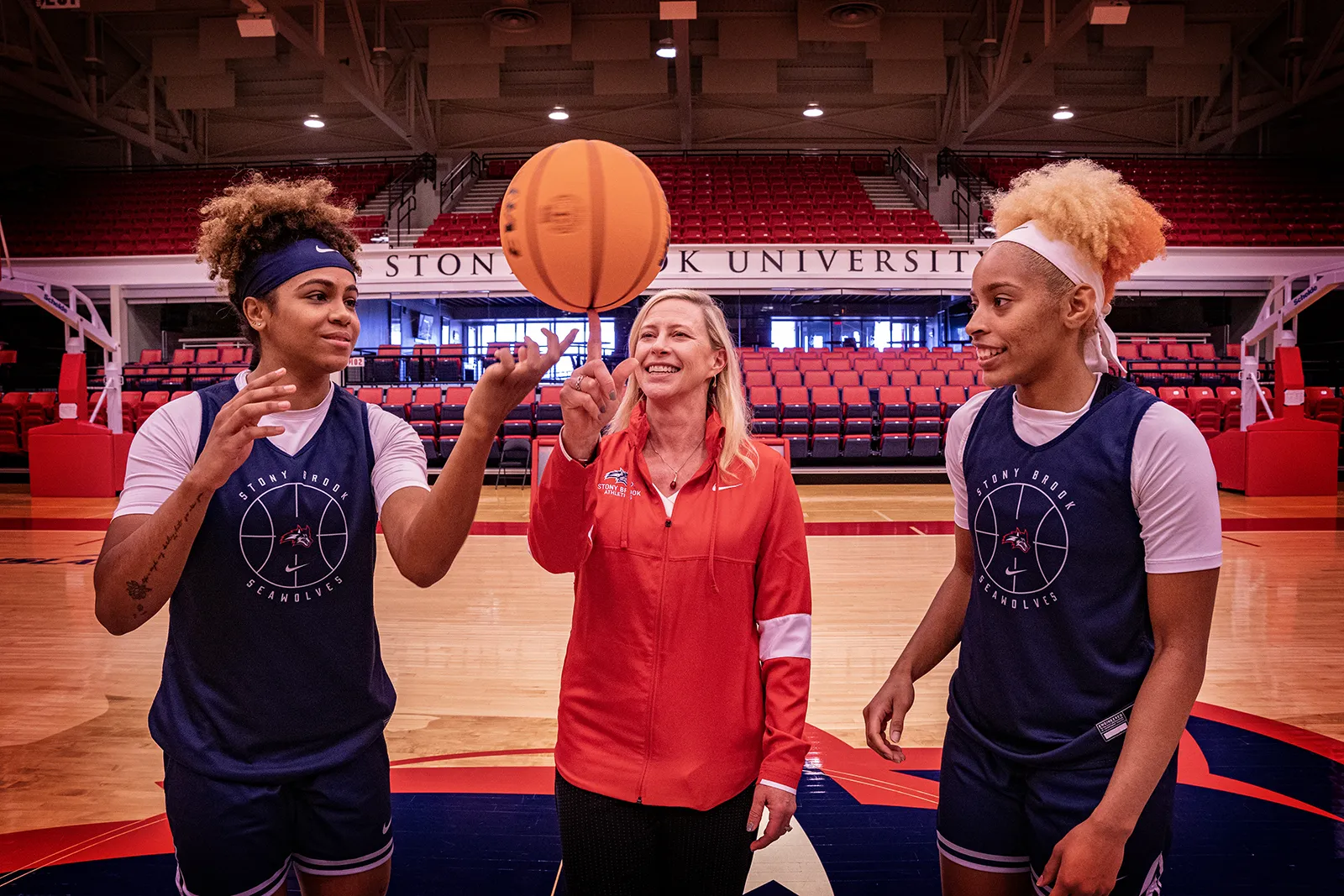 Stony Brook University President Maurie McInnis meets and greets the Womens Basketball team including Co-Captains (L-R) Gigi Gonzalez and Annie Warre.