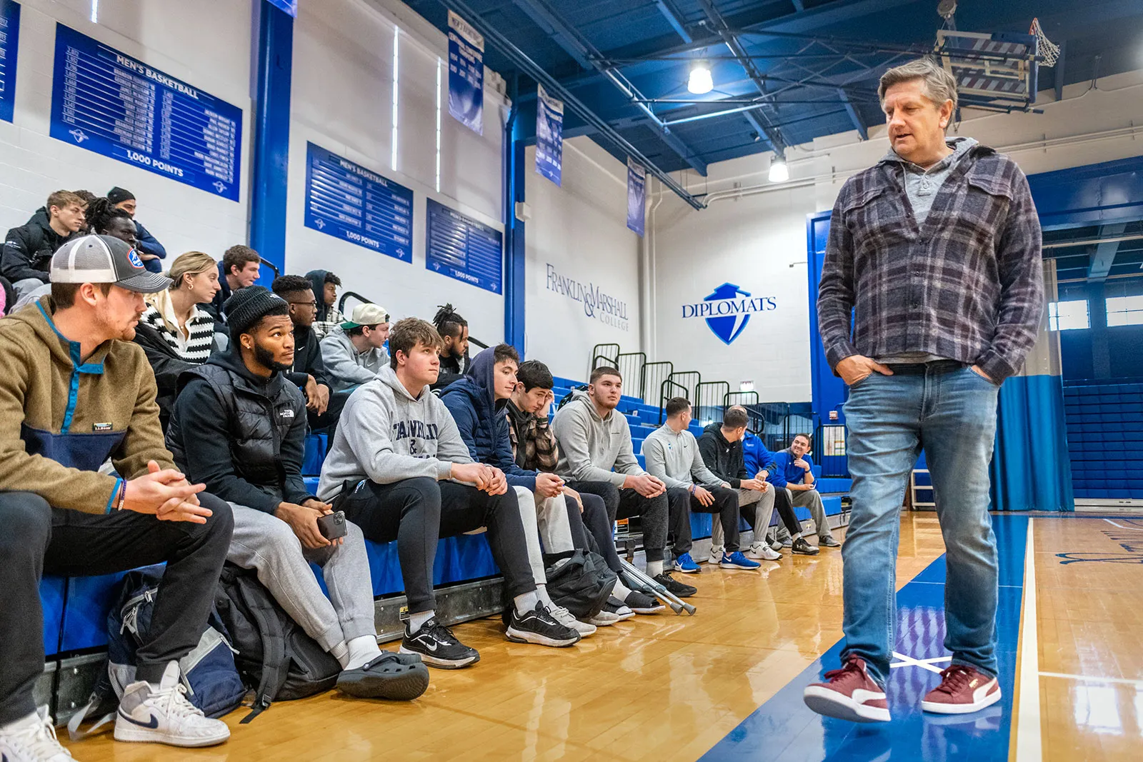 Alumnus, Chris Finch '92, makes a surprise visit with the men's and women's basketball teams. He is currently the coach of the NBA's Minnesota Timberwolves. He spent about an hour talking with the students about college, life, and of course, basketball.