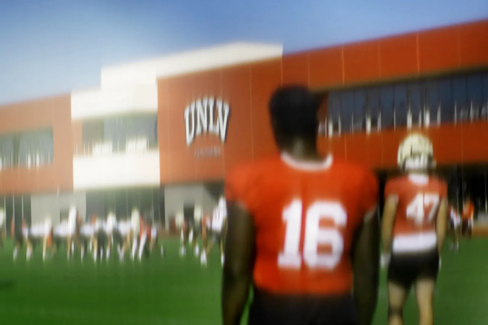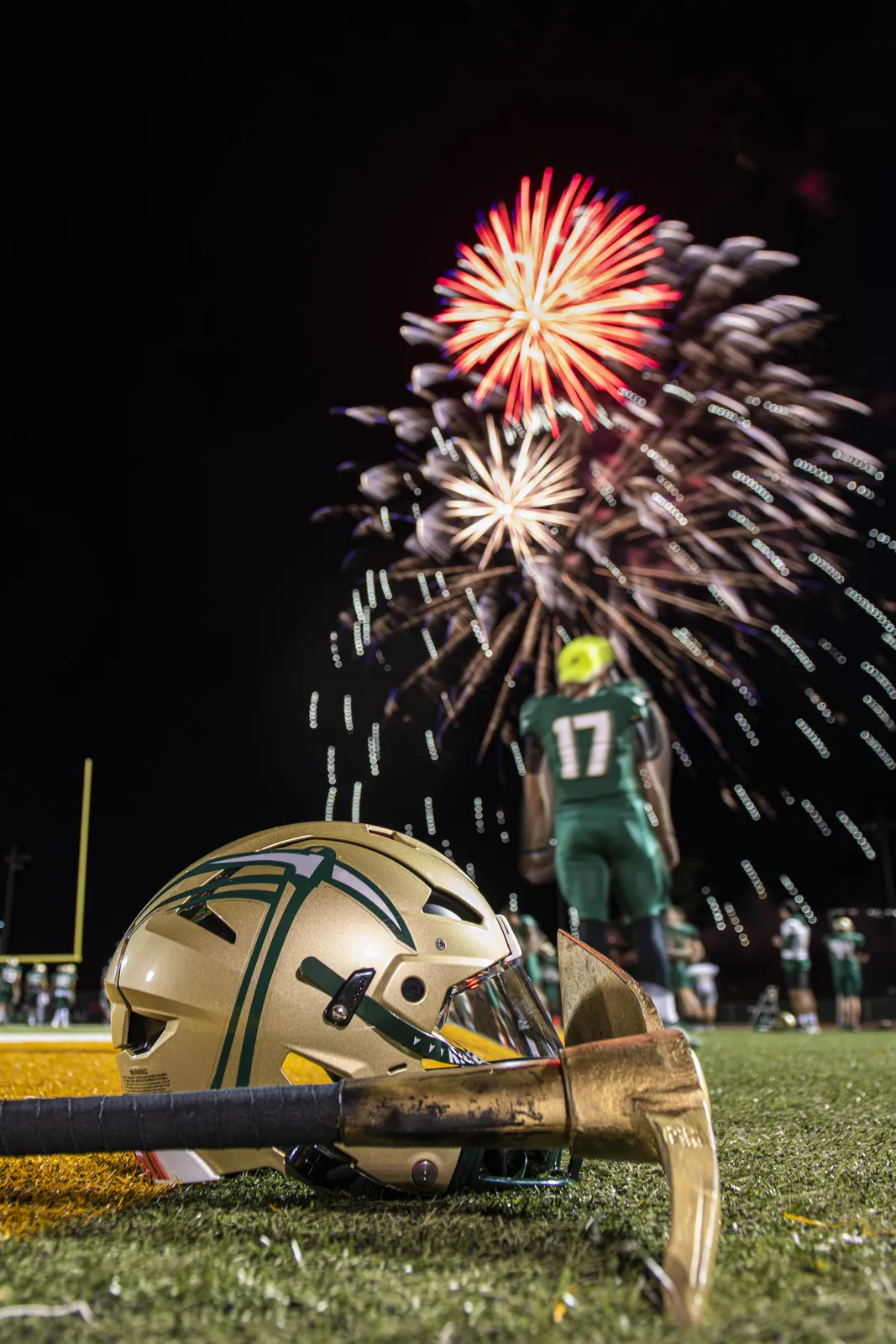 Several Miners football players warmup at the end of halftime while fireworks are set off next to the stadium by students in the mining and explosives program.