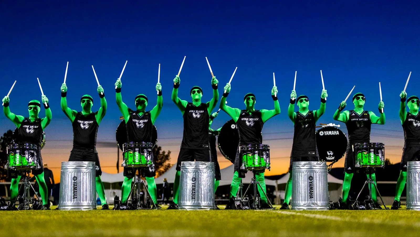 The Green Man Group drum line performance team entertains the fans during a halftime show.