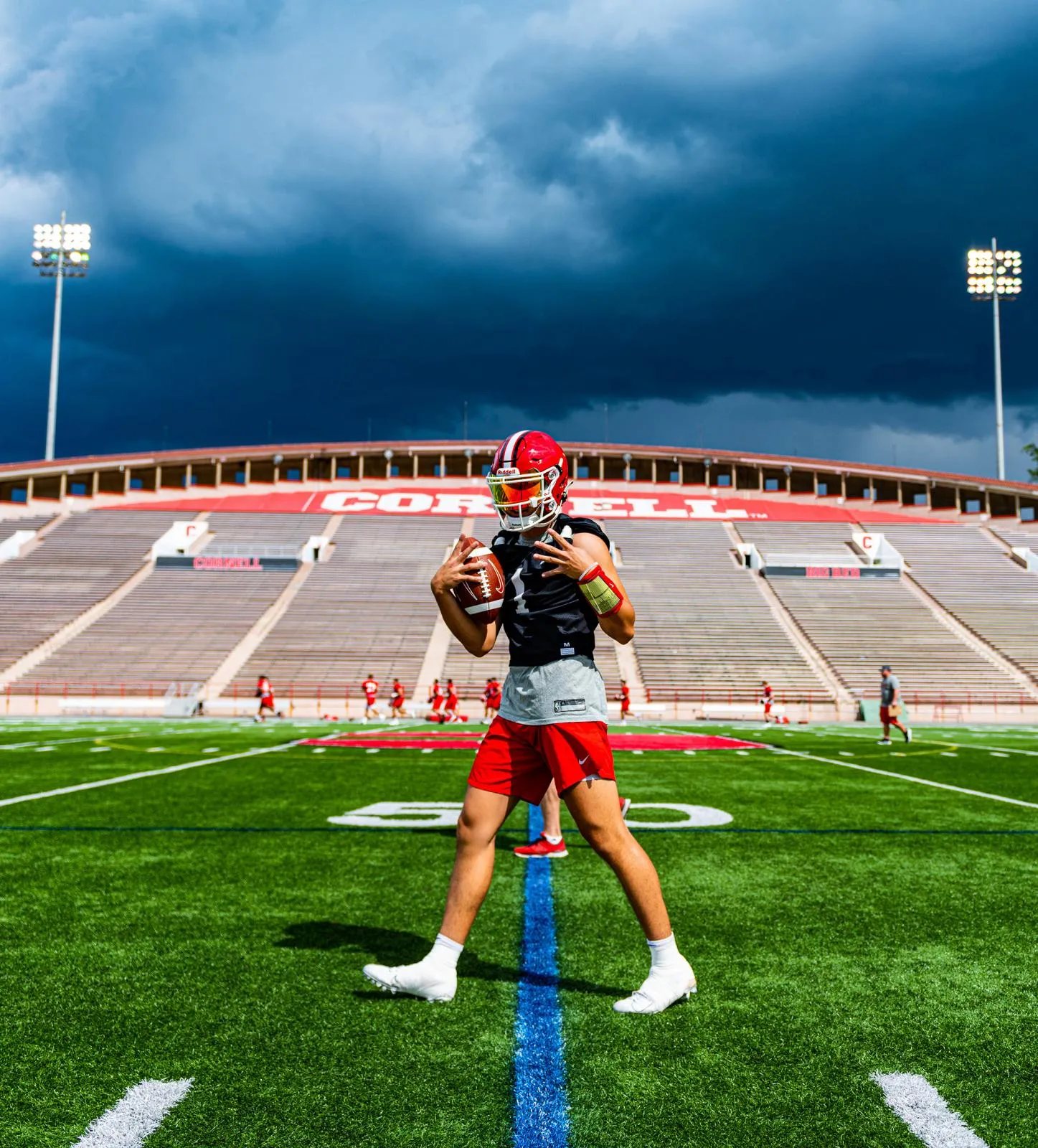Cornell Big Red sophomore quarterback Jameson Wang poses quickly for the camera before exiting Schoellkopf Field after lightning was seen in the dark distance behind the stadium at practice on Aug. 17, 2022.