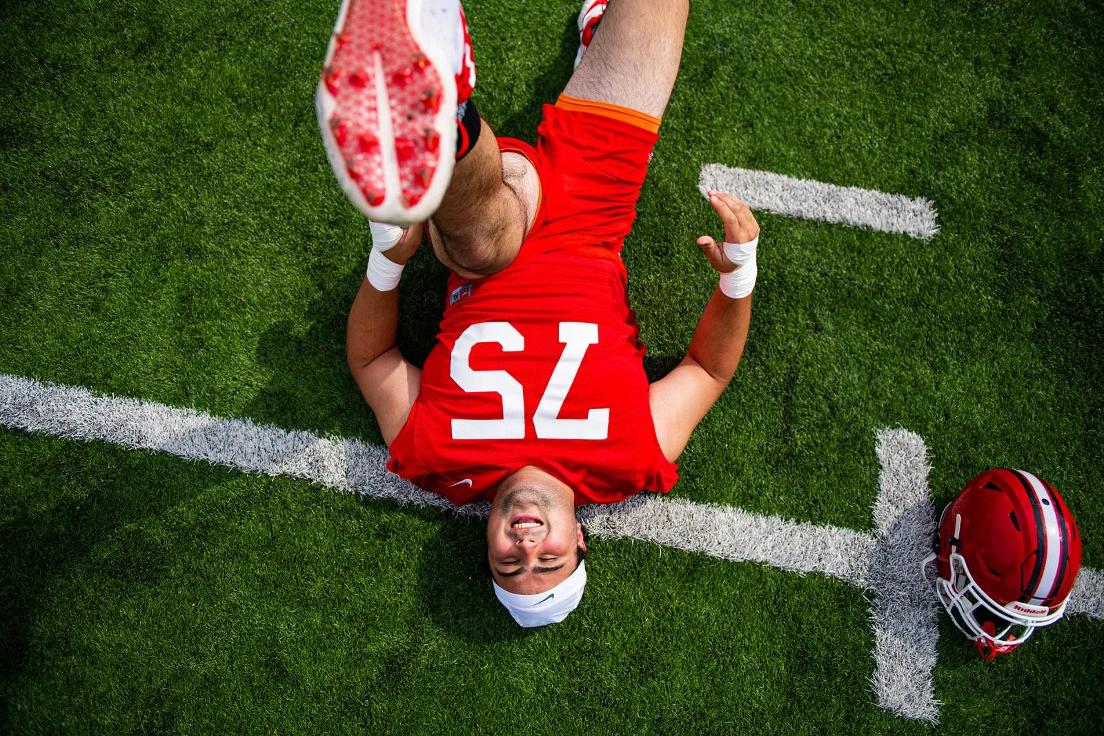 Cornell Big Red offensive lineman Micah Sahakian smiles as he stretches during practice on Aug. 18, 2022 on Schoellkopf Field in Ithaca, NY.