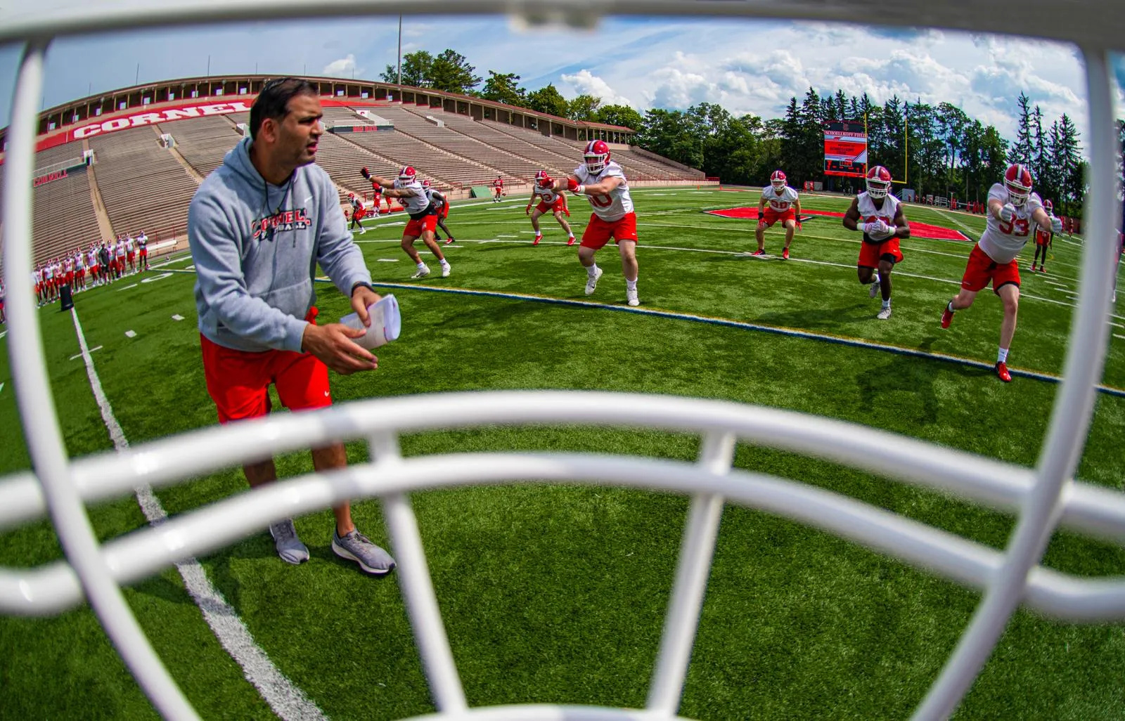 As seen from the player perspective behind the face mask, Cornell Big Red defensive line coach Satyen Bhakta runs through a defensive run drill near midfield of Schoellkopf Field during practice on Aug. 18, 2022 in Ithaca, NY.