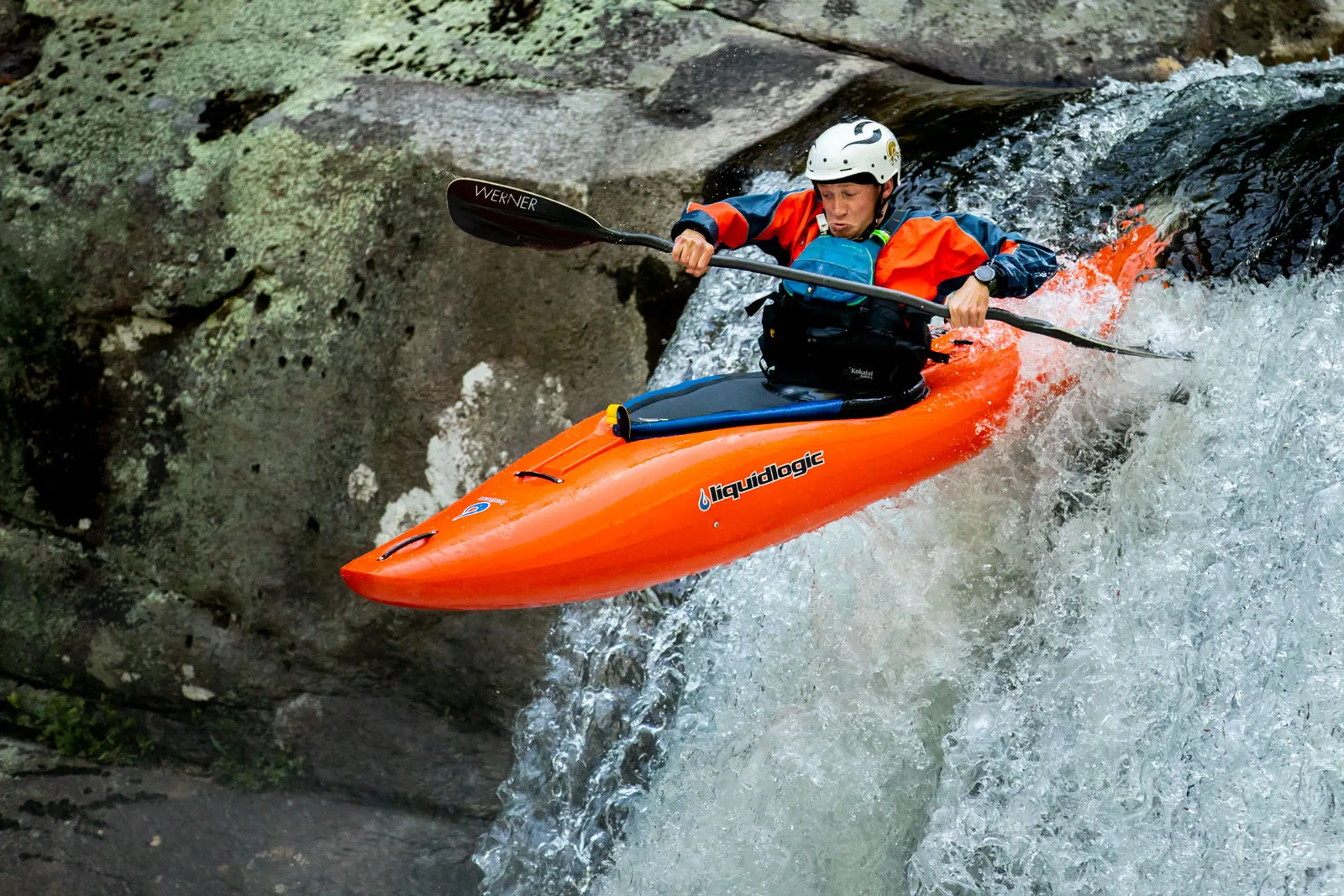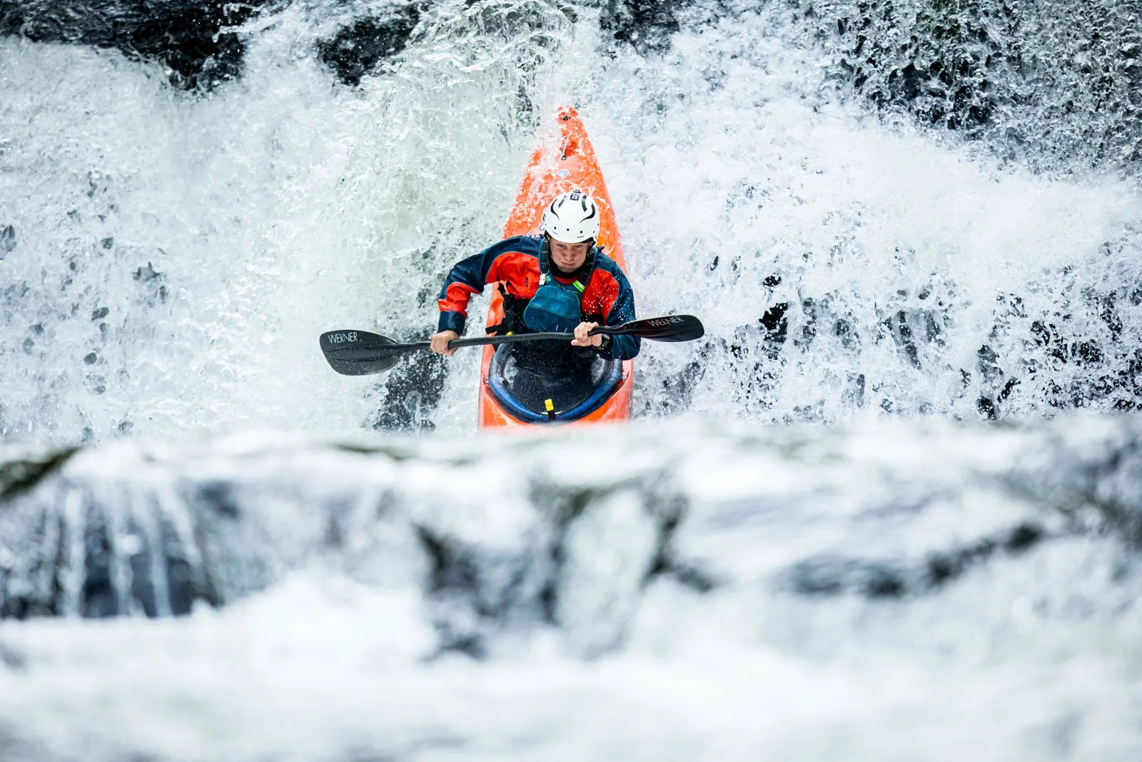 A student rides his kayak through a set of waterfalls during an outdoor pursuits adventure.