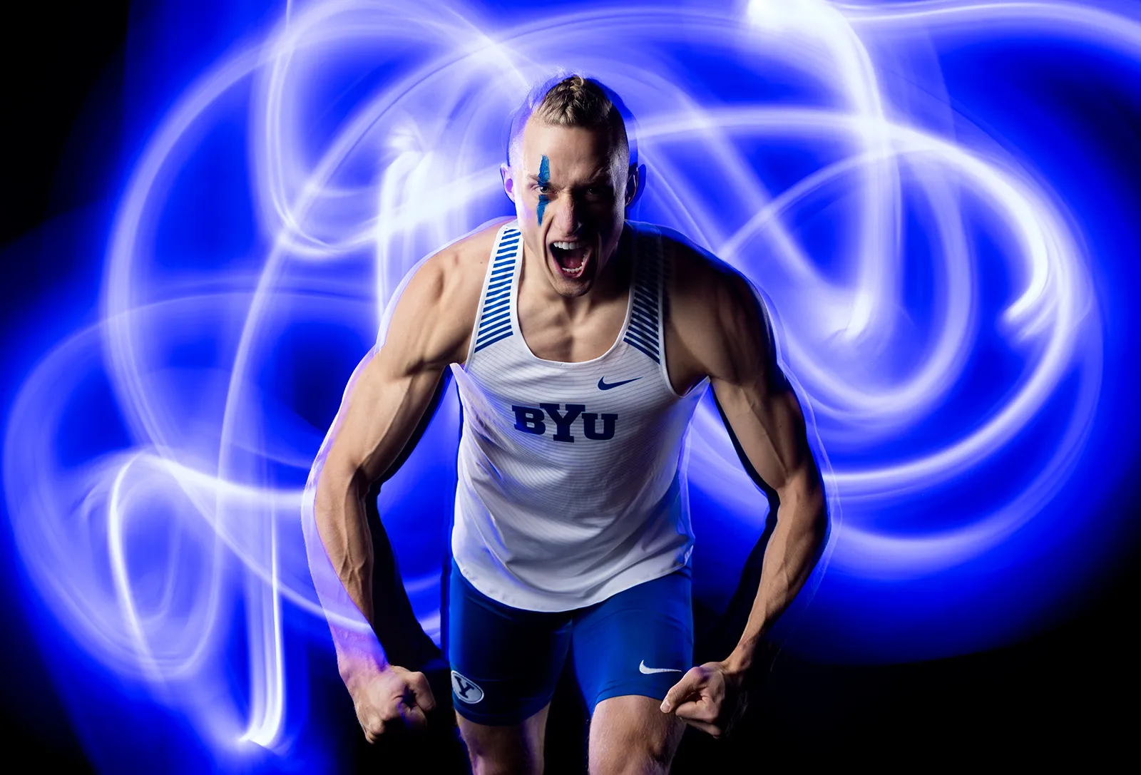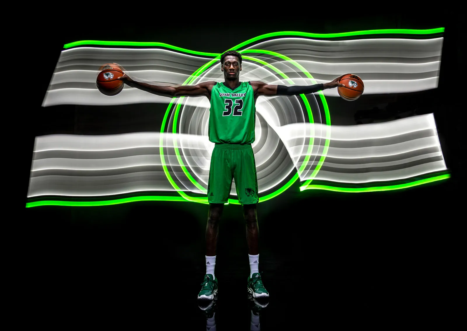 Aziz Bandaogo poses for a promotional photo to announce his signing to play for the university men's basketball team. Bandaogo is a key recruit to fill a whole in the team created by the transfer portal. The shot was created completely in-camera.