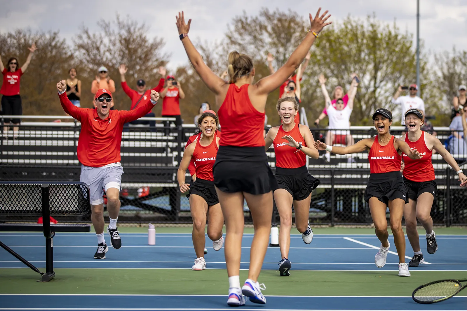 Teammates celebrate after the deciding point for the MAC Regular Season Championship.