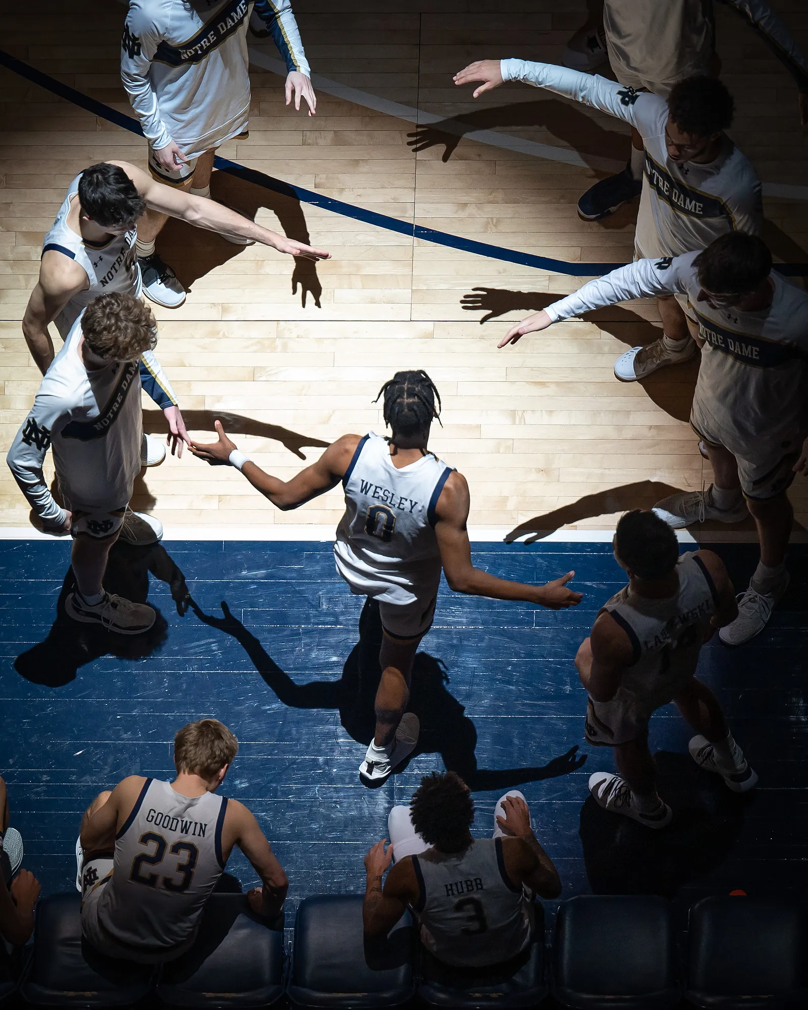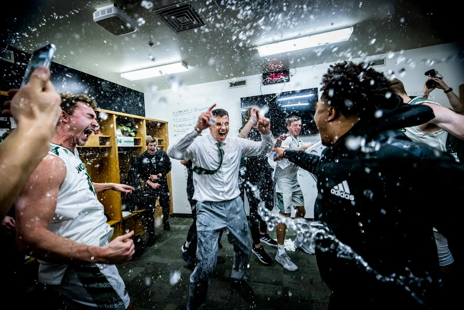 Head coach Mark Madsen is greeted in the locker room with a wall of water after the team's 72-65 win over their crosstown rivals who were ranked twelfth in the nation. The team waited with buckets and bottles of water for what seemed like forever for the coach to finish with postgame interviews so they could dowse him with water.