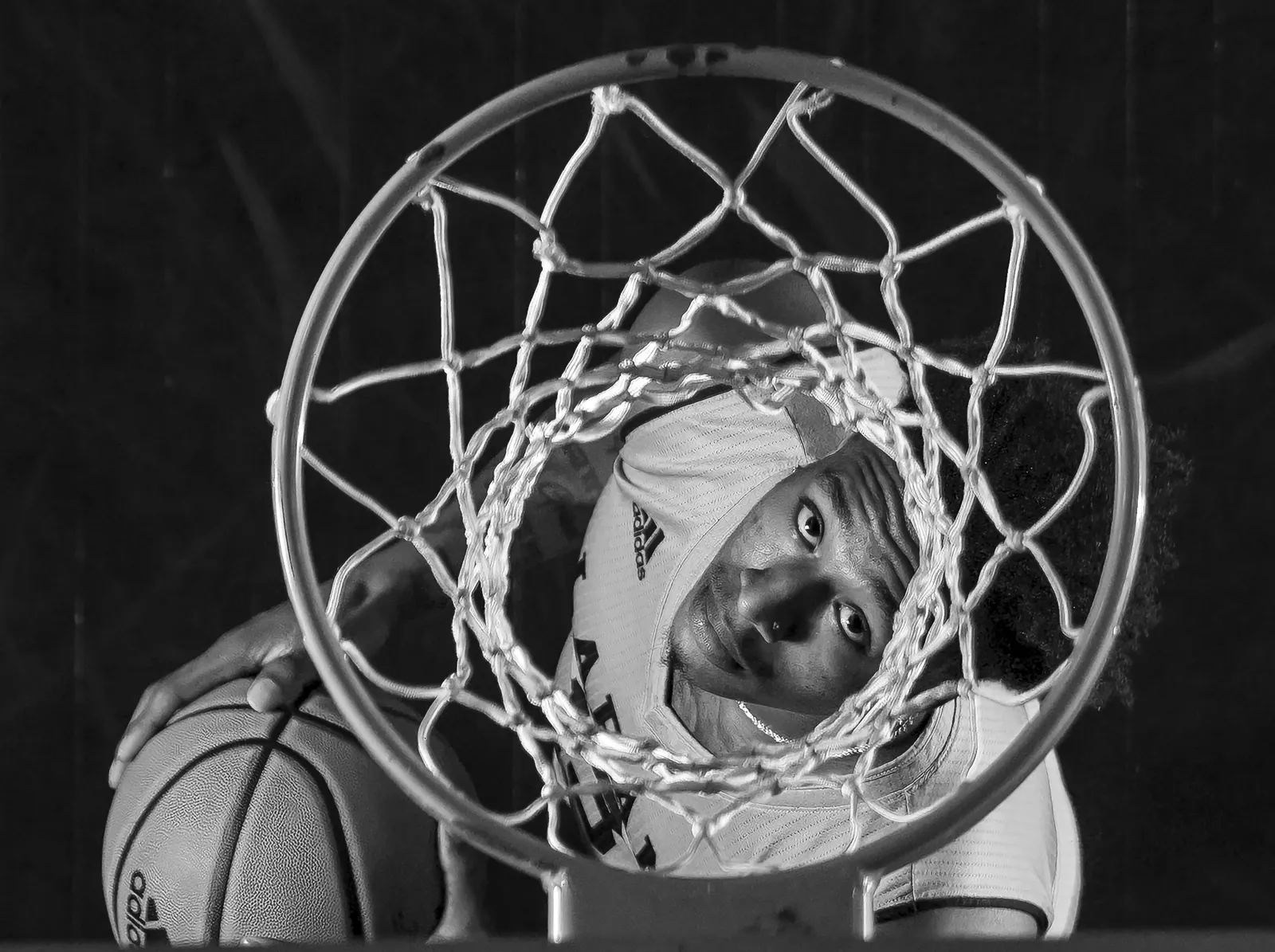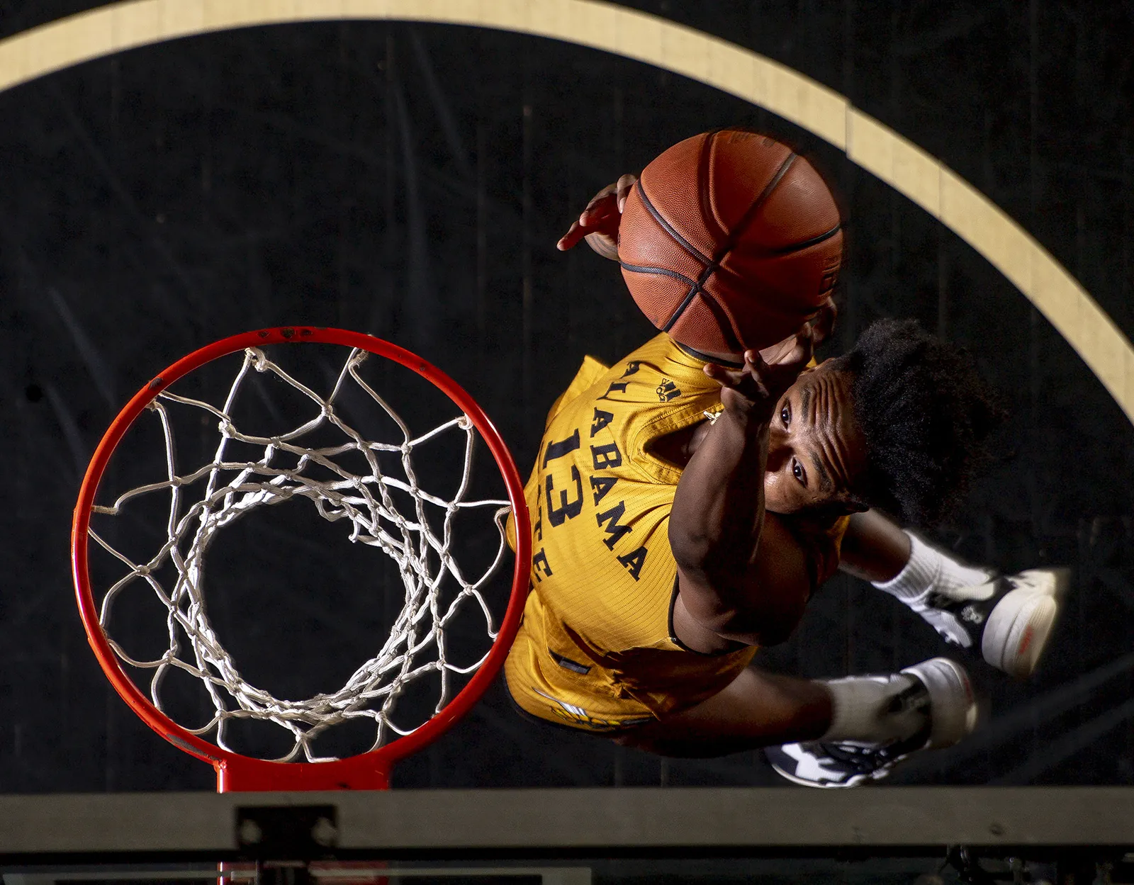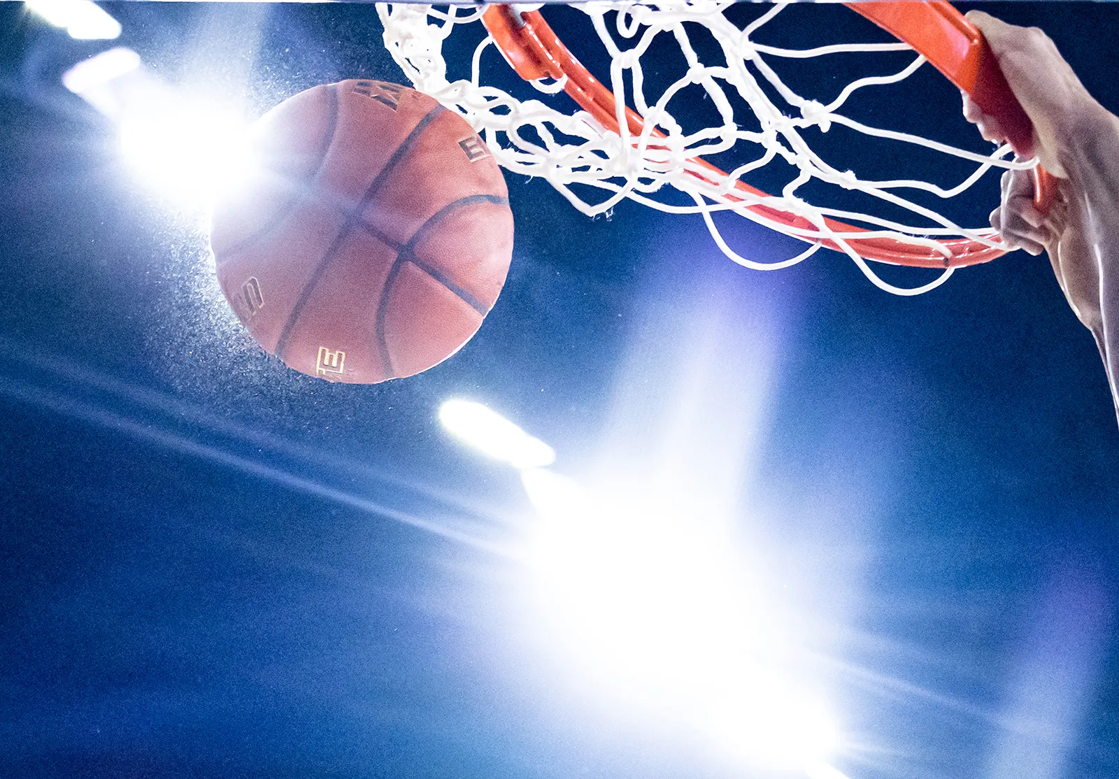 A puff of dust comes flying off the basketball after it gets dunked through the hoop during a UMass-Lowell men’s basketball game.