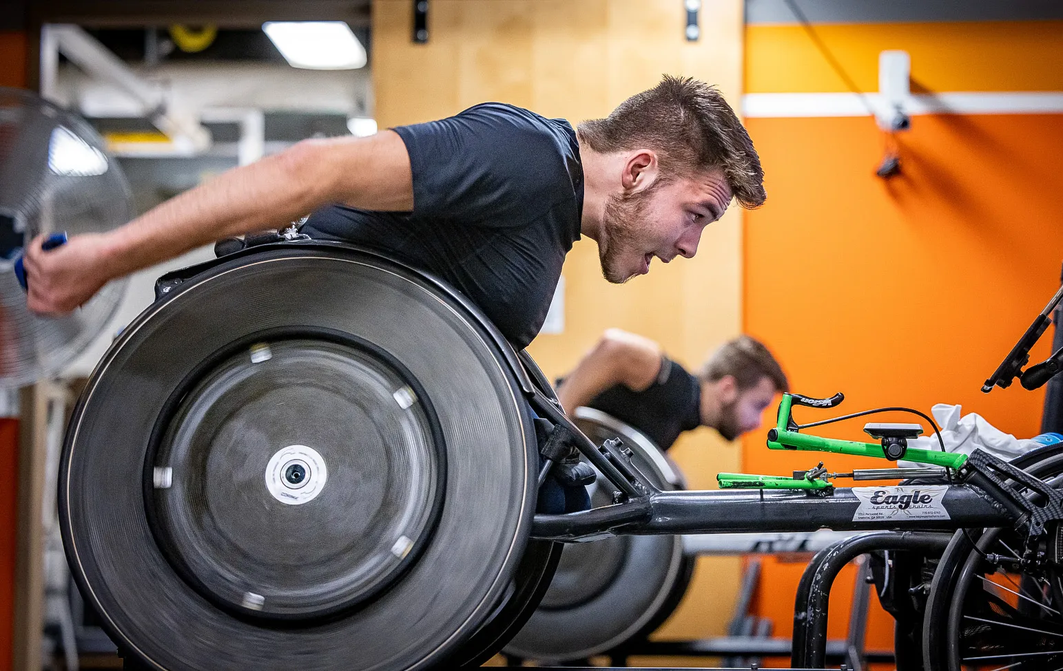 Elite wheelchair athlete Jason Robinson trains on a special roller machine that adds resistance to simulate hills he’ll face on outdoor marathon routes in the Paralympic training facility at the Disability Resources and Educational Services building. Competitors are preparing for the next international paralympics.