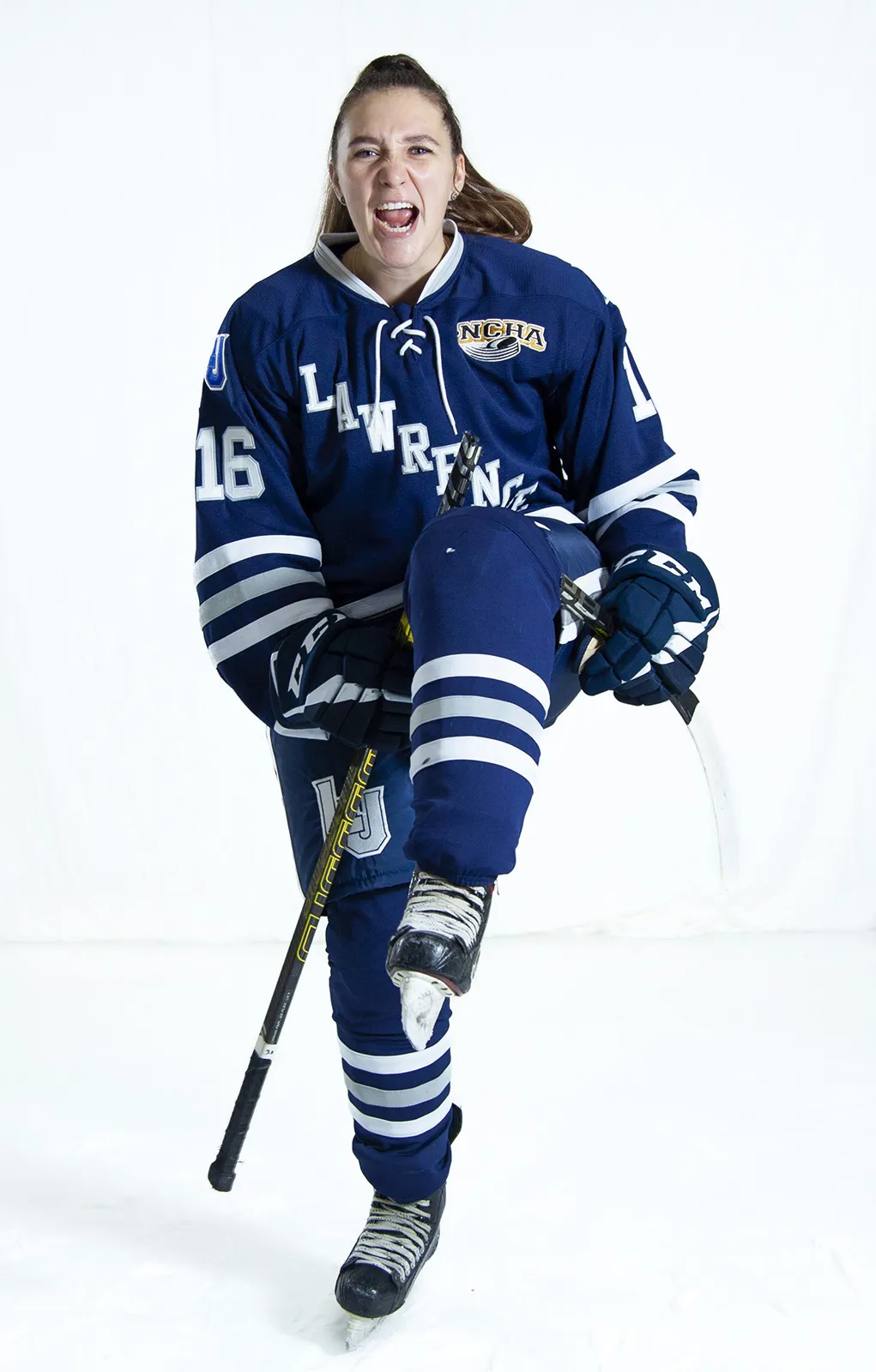 Maggie Macneil ’25 poses for a portrait with a broken hockey stick during women’s hockey media day Nov. 9, 2021.