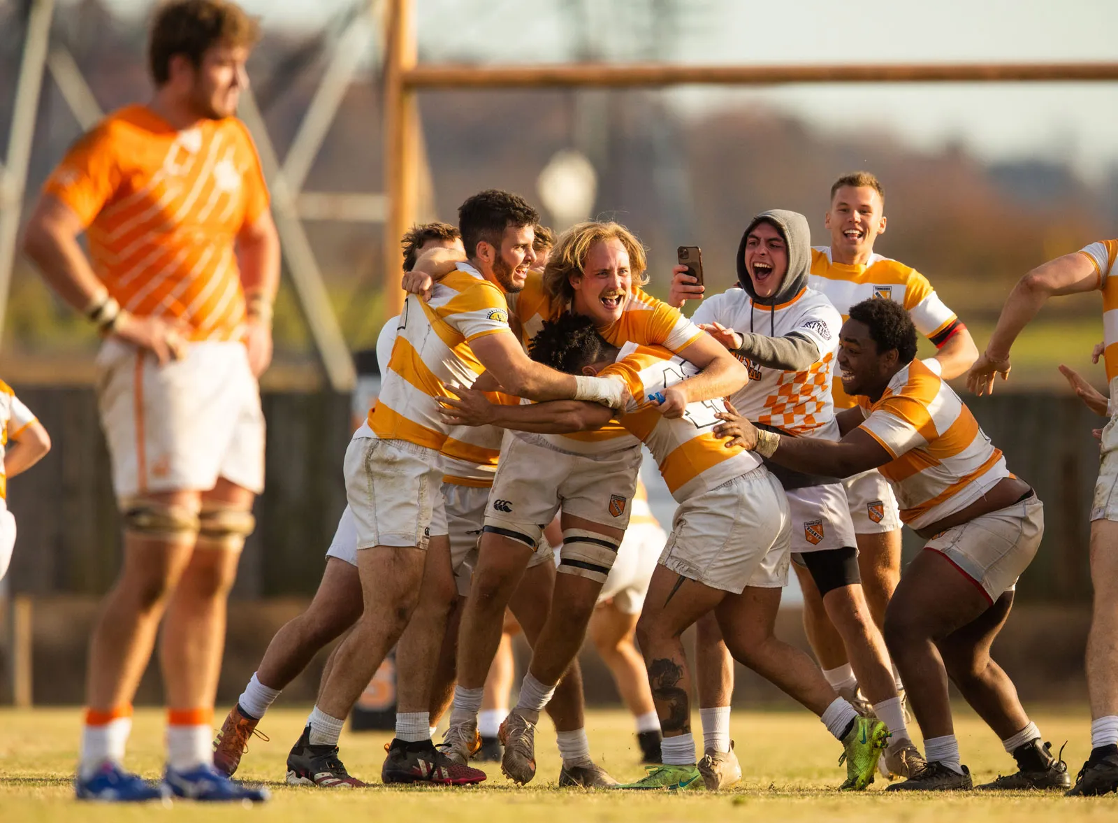 The rugby team celebrates after winning their conference championship.