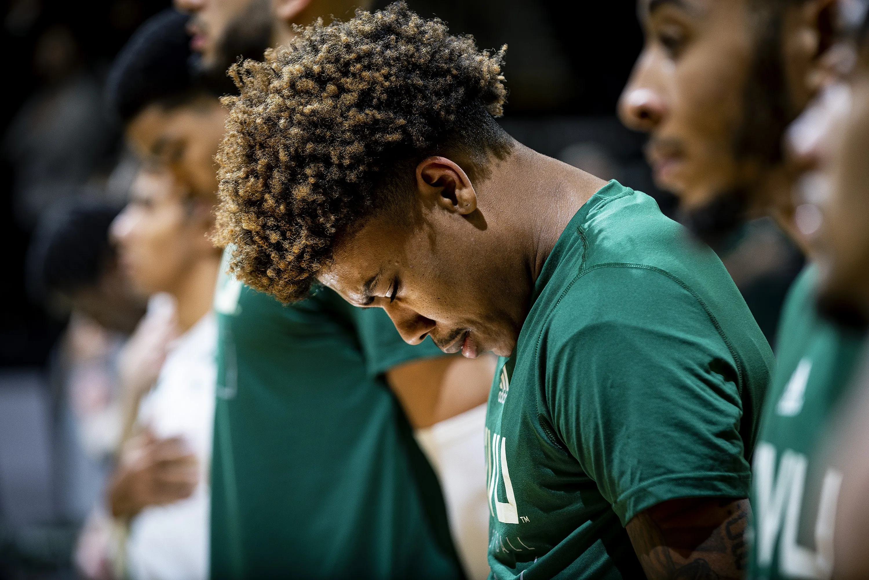 Utah Valley University guard Justin Harmon prays before the men’s basketball team took on the Denver Pioneers at the UCCU Center on the campus of UVU in Orem, Utah, on Saturday, Nov. 27, 2021.