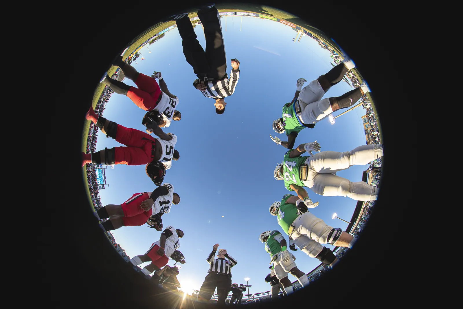 A referee initiates the coin toss prior to the start of the NCAA Division II football game between the West Florida Argonauts and the Valdosta State Blazers on Nov. 13, 2021 at Blue Wahoos Stadium in Pensacola, Florida.