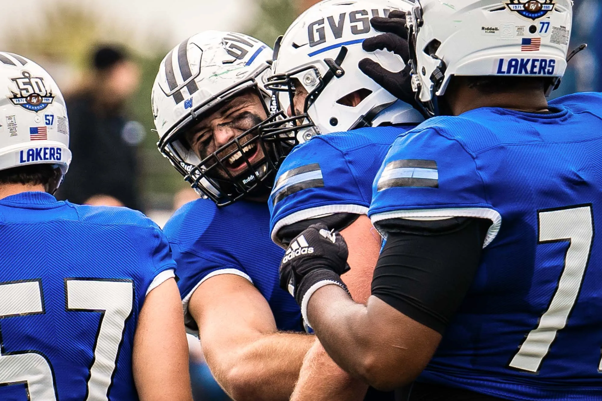 Grand Valley State University football players celebrate after scoring a touchdown against Michigan Tech on October 30.