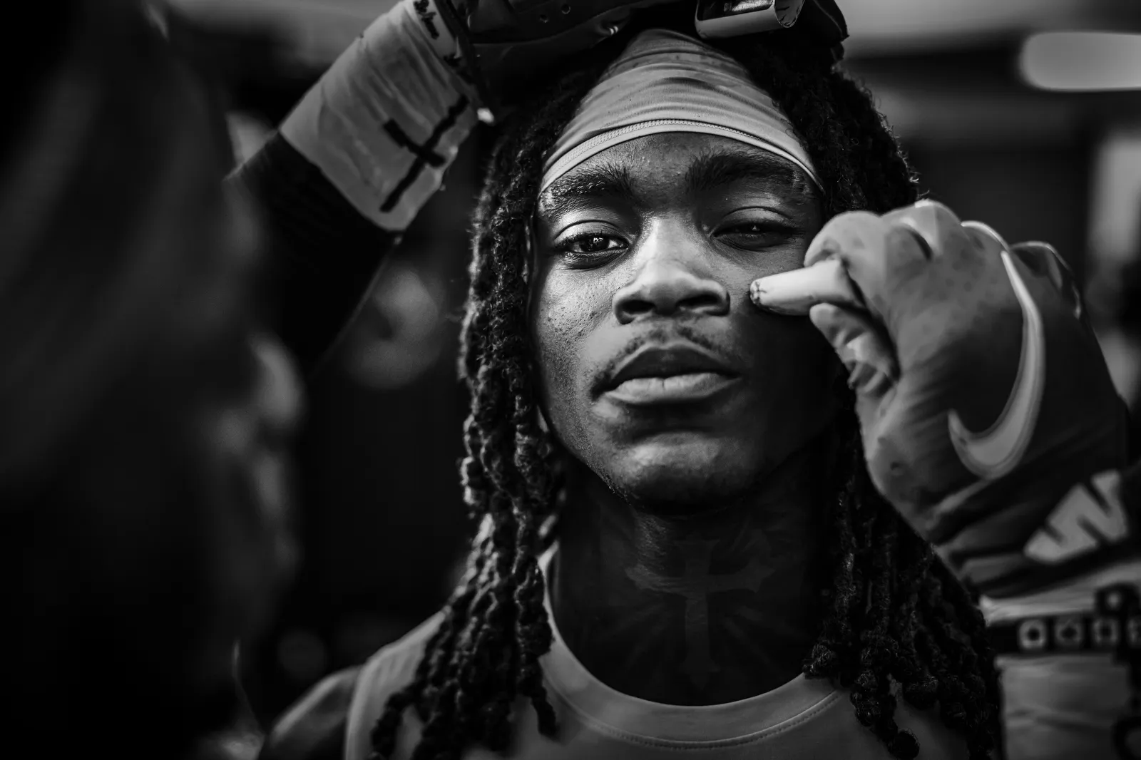 Teammate helping put on eye black for homecoming game in locker room at Fort Valley State University in Georgia.