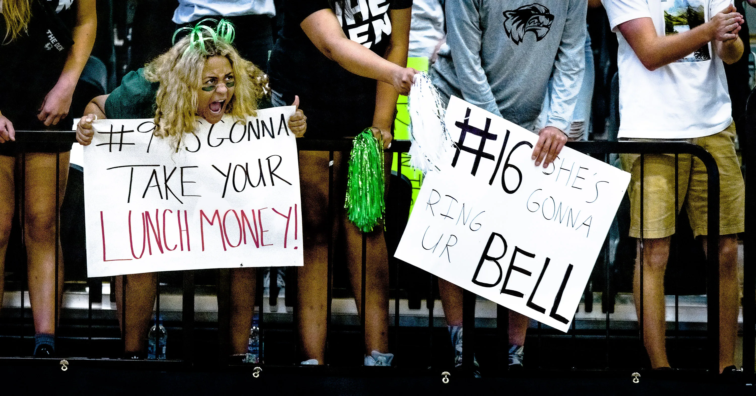 Fans cheer as the Utah Valley University women’s volleyball team takes on Brigham Young University in Lockhart Arena on the campus of UVU in Orem, Utah, on Saturday, Sept. 18, 2021.