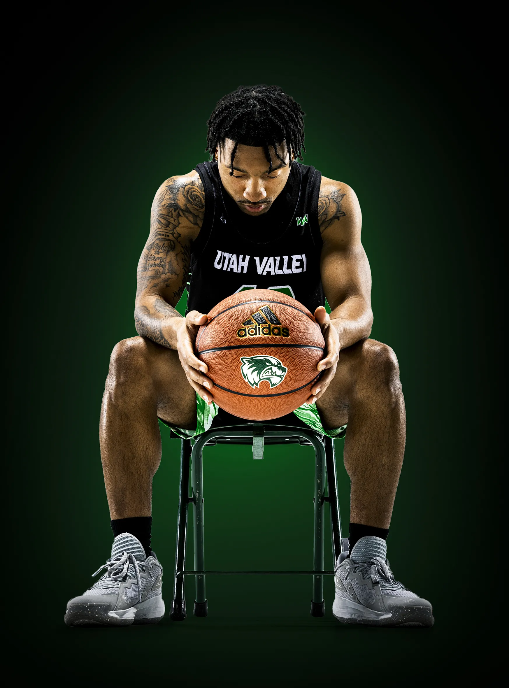 Men’s basketball players pose for promo photos as part of media day held in the studio on the campus of Utah Valley University in Orem, Utah, on Monday, Sept. 27, 2021.