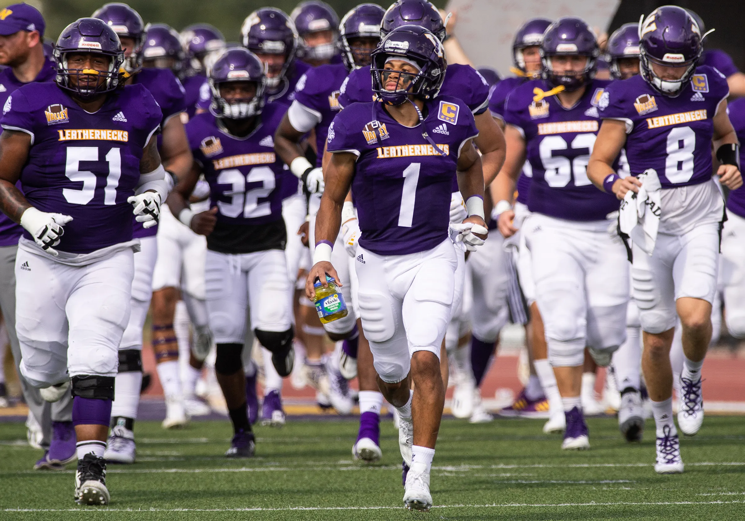 A football player carries a jar of Vlasic pickles onto the field before game action.