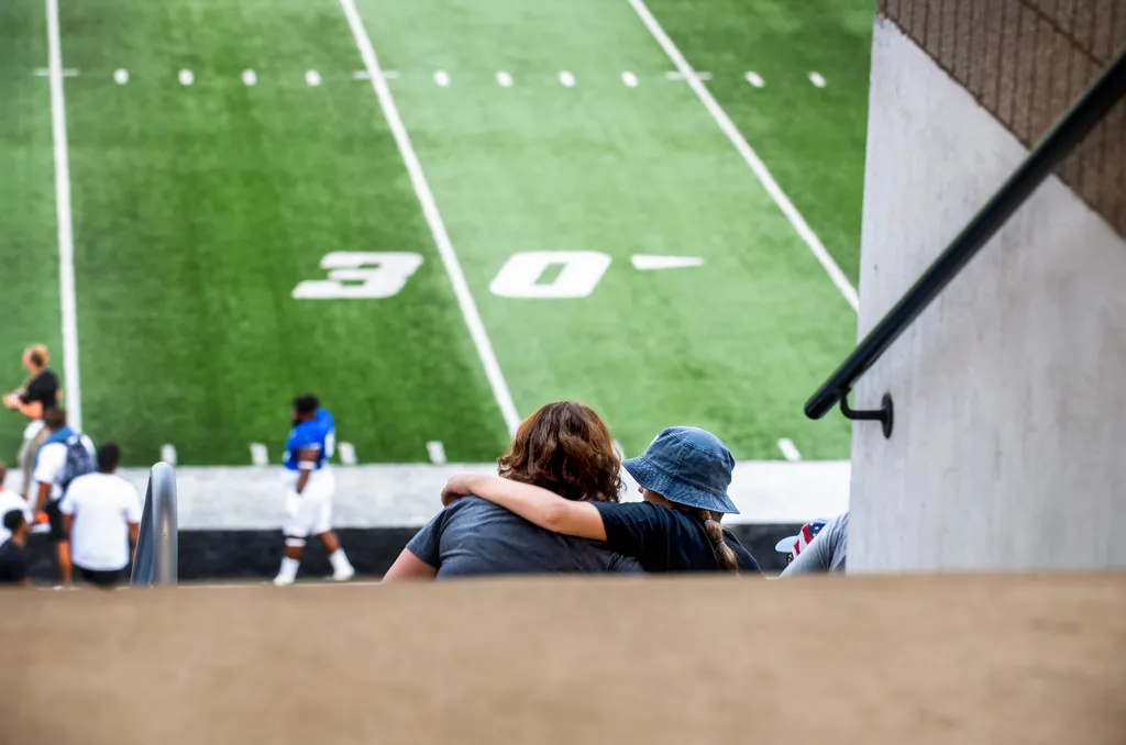 Attendees of Grand Valley's football game against Colorado State-Pueblo on September 11 share a hug.