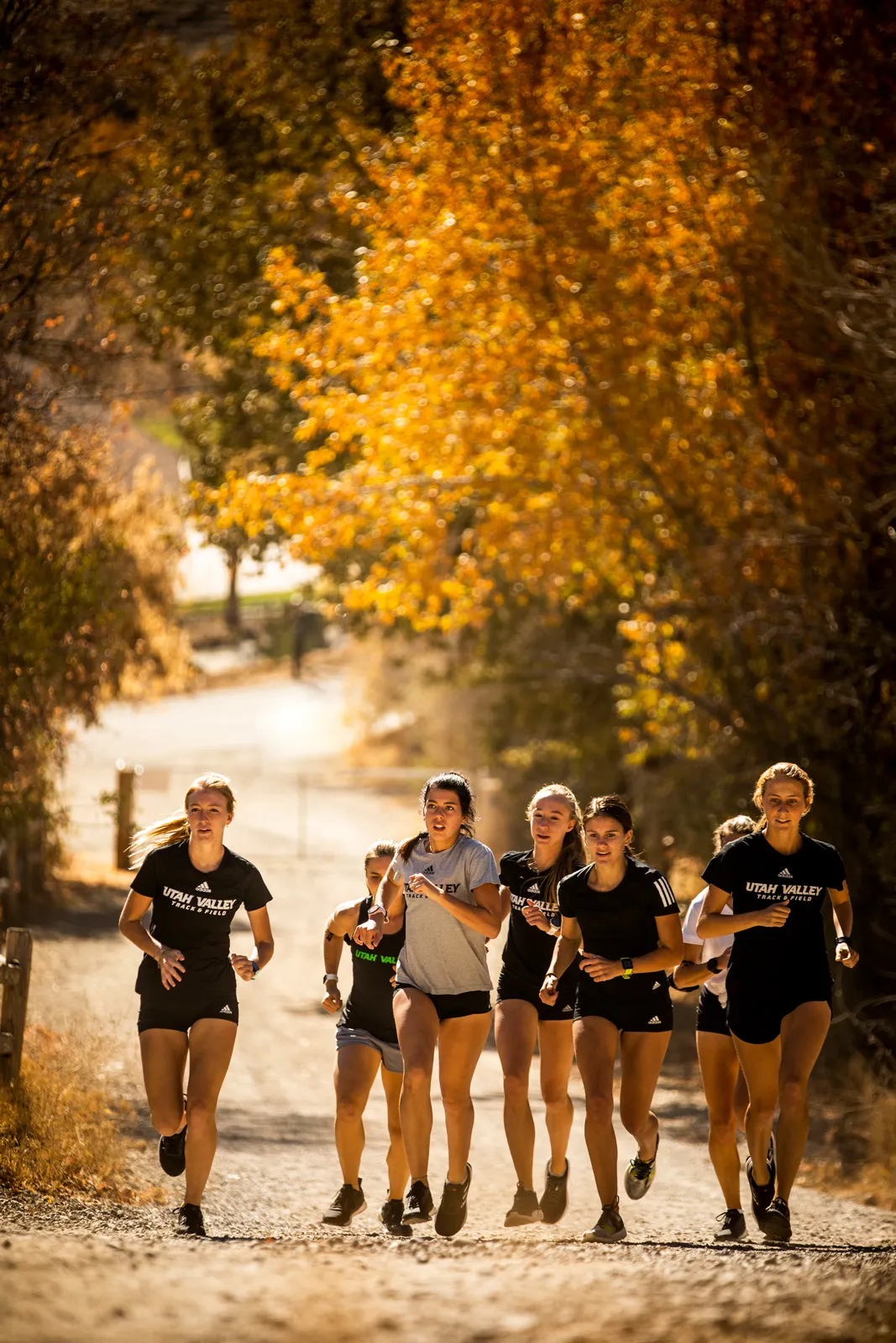 The women's cross country team runs up an access road during a recent practice run.