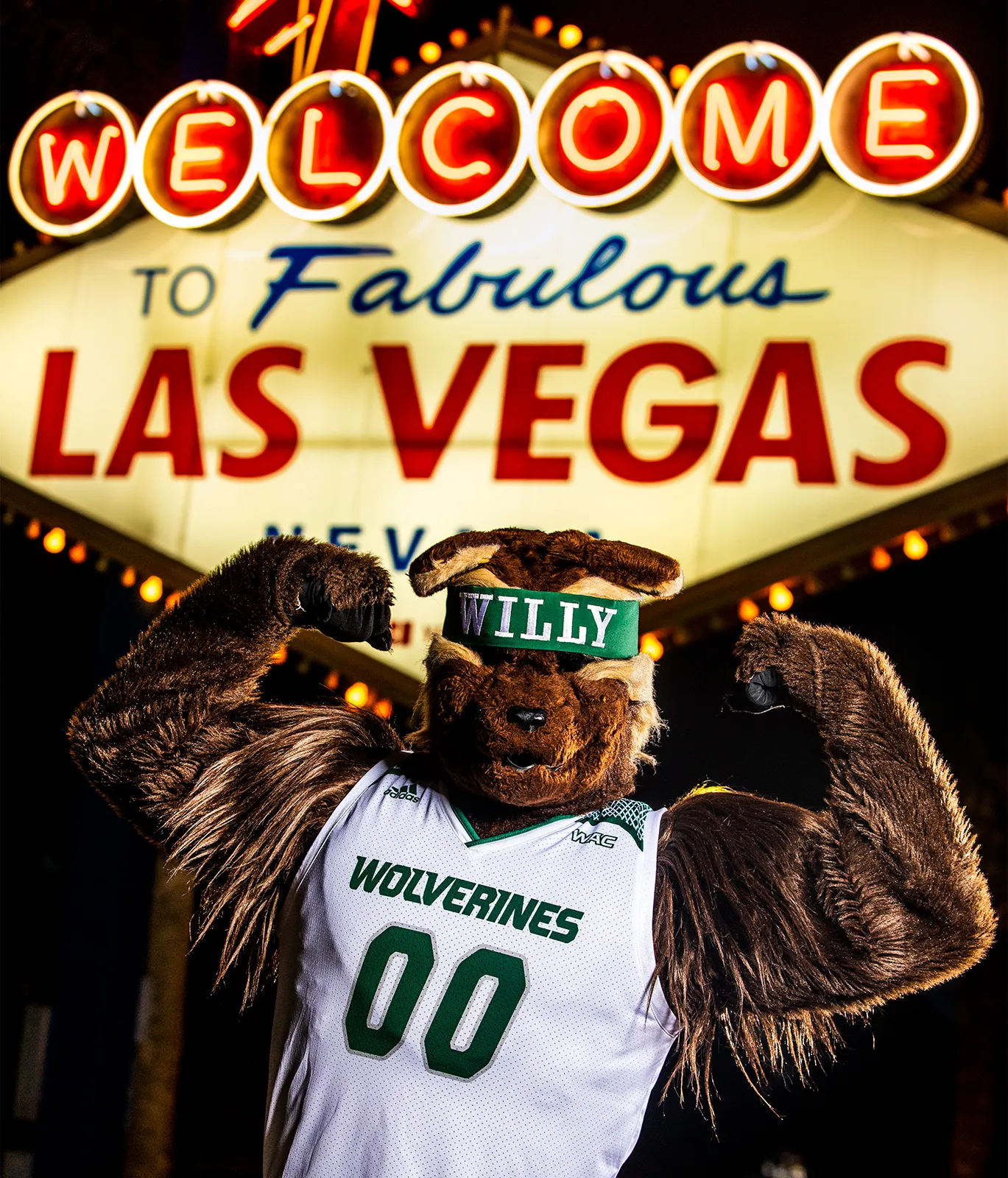 Willy the Wolverine flexes in front of the Fabulous Las Vegas sign on the Vegas Strip the night before the start of the 2020 WAC Tournament. The shoot was used for social media this year and will be used next year to promote attendance at the annual tournament.