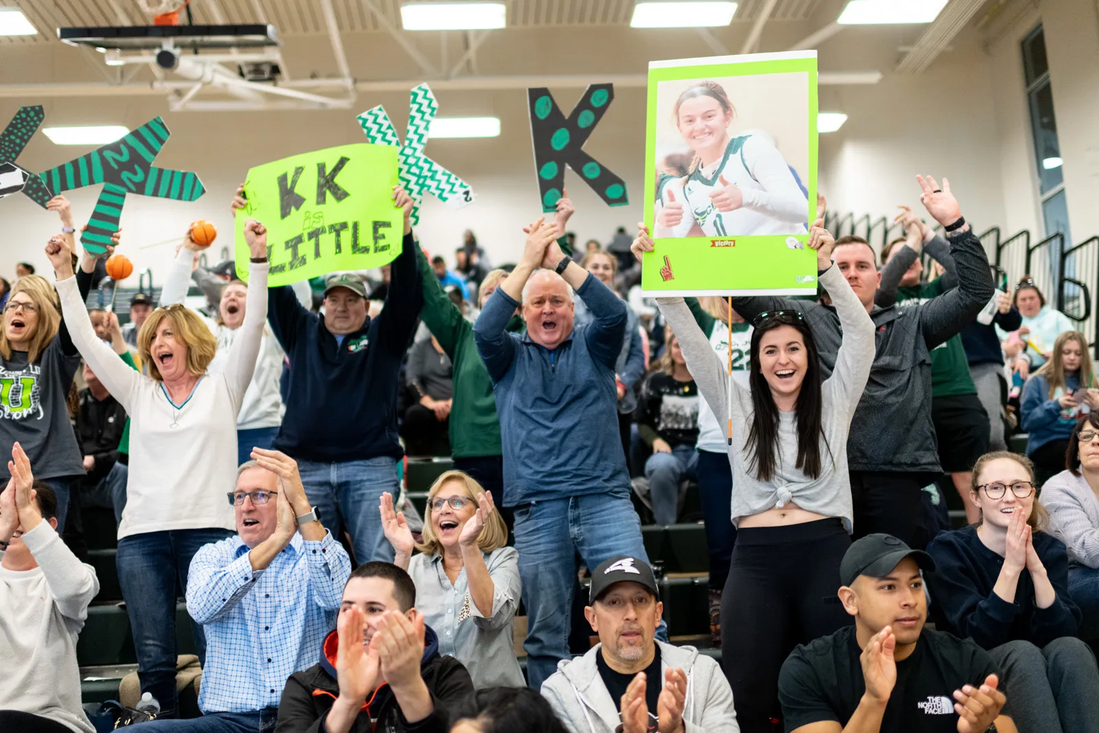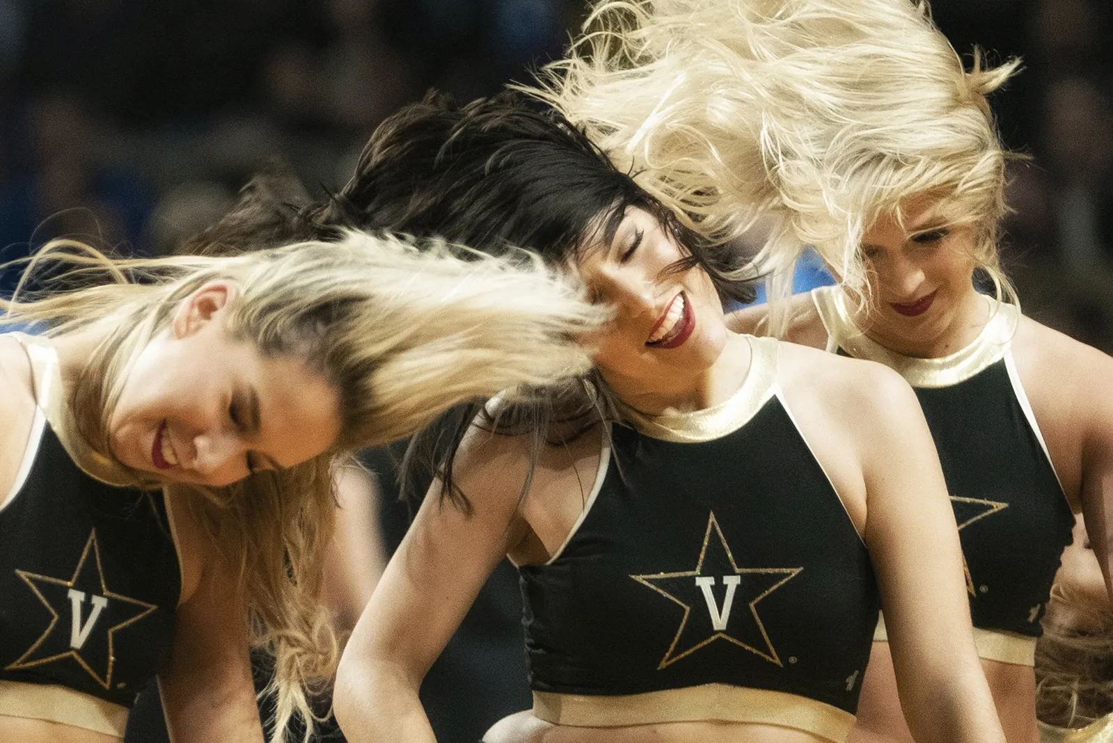 The dance team entertains fans during a halftime show at Memorial Gym.