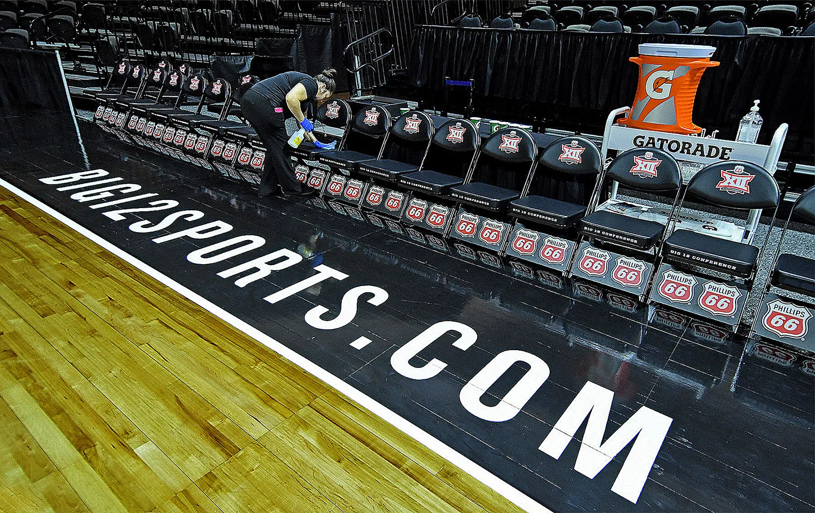 A woman sanitizes the seats of a team bench before the Big 12 Women’s Basketball Championship at Municipal Auditorium in Kansas City, Missouri. The Big 12 Conference cancelled the championship due to fears of COVID-19, more commonly known as the coronavirus.