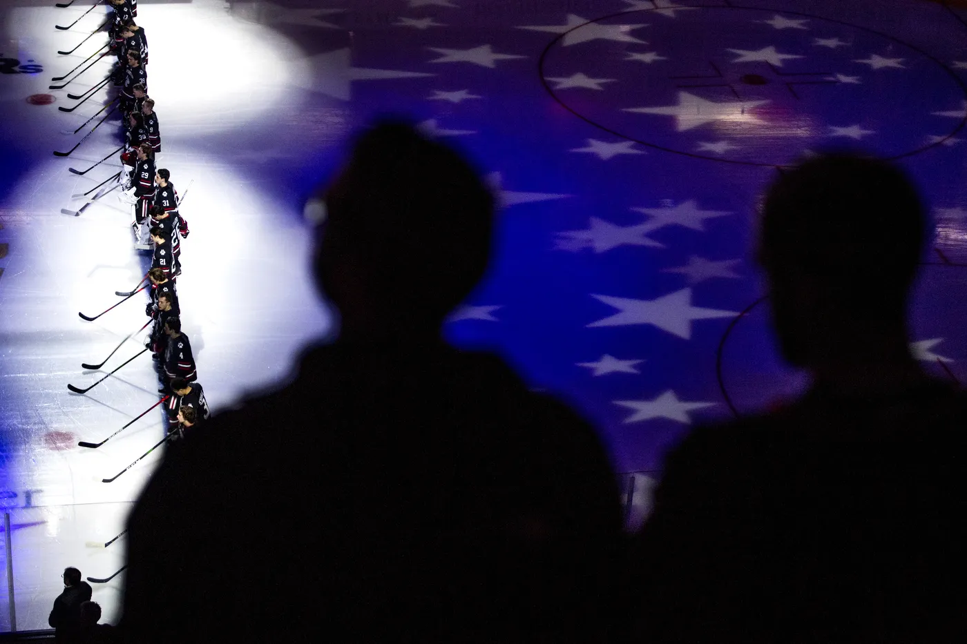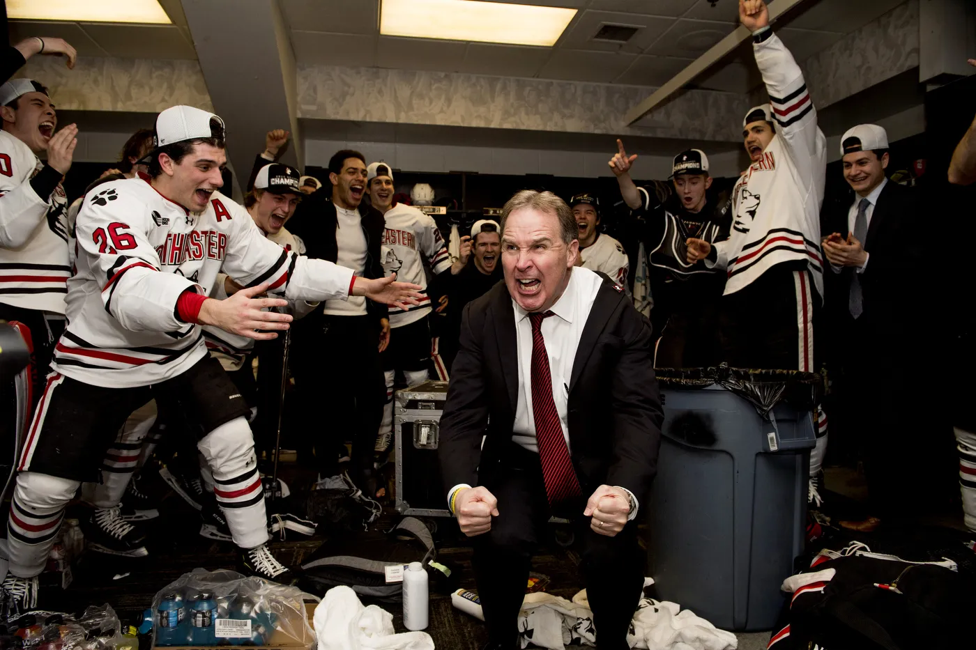 Men's Ice Hockey Coach Jim Madigan celebrates the 2020 Beanpot victory over Boston University.