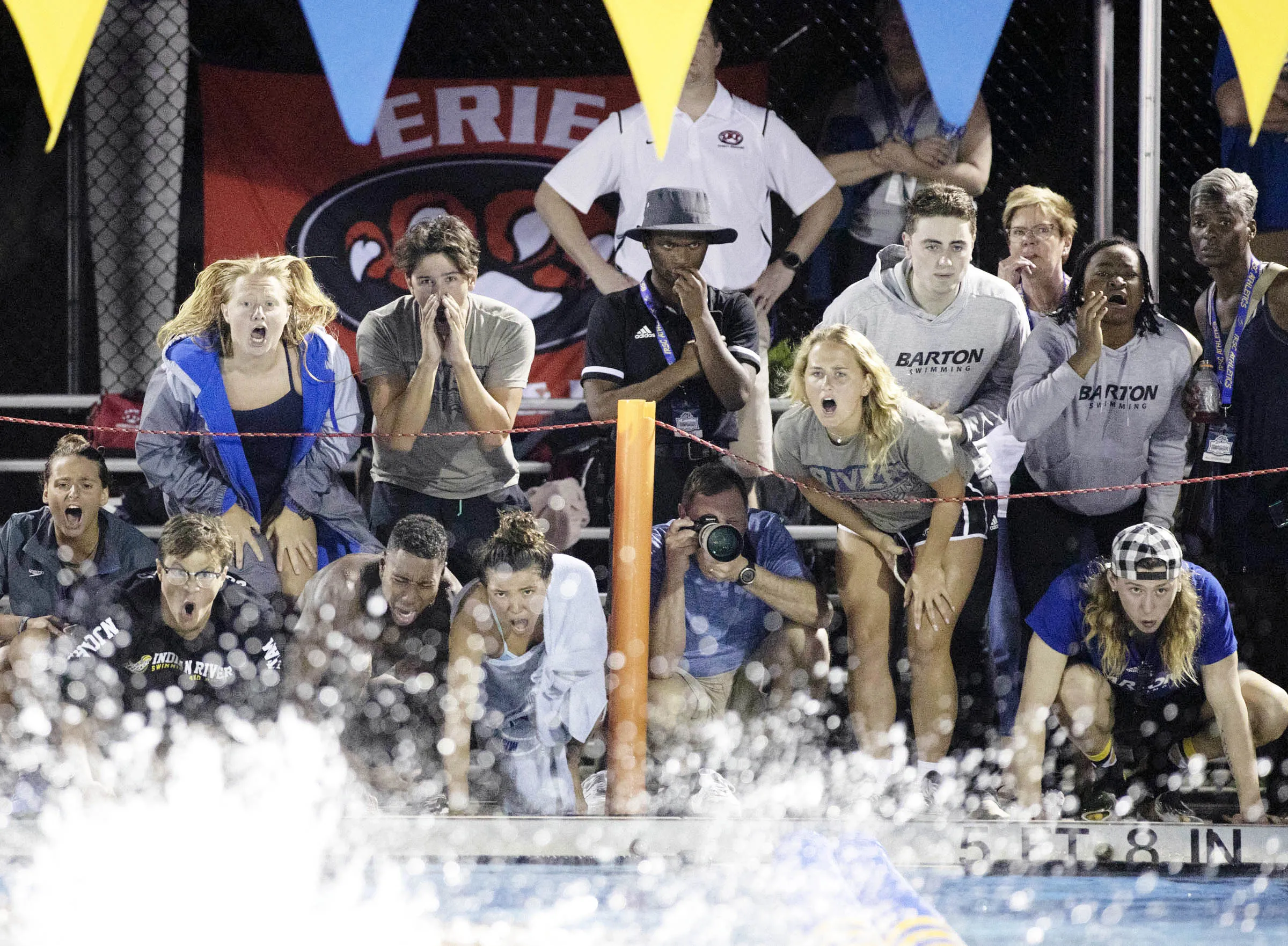 Teammates cheer for various swimmers on the second day of the 2020 NJCAA Men’s & Women’s Swimming & Diving Championships which were held on Thursday, March 5, 2020, at Indian River State College in Fort Pierce.