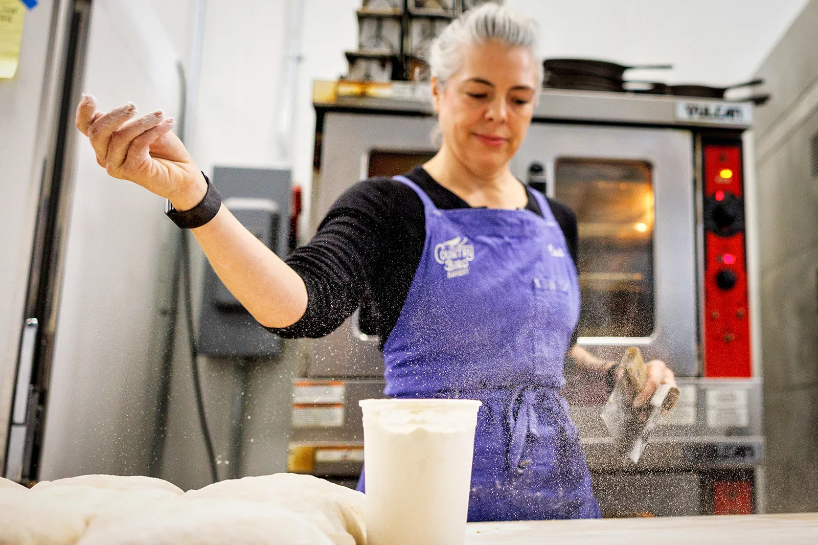 Cat Cox, 2025 James Beard-winning baker, throws down some stone-ground Oklahoma wheat as she prepares sourdough bread loaves at Country Bird Bakery in Tulsa on Wednesday, Nov. 5, 2025.
