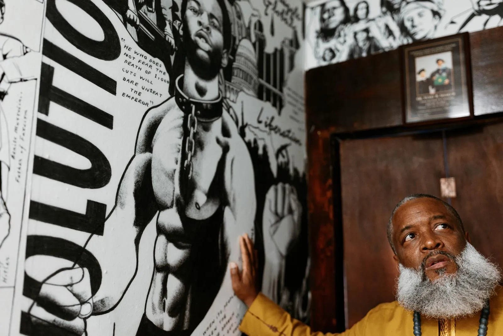 University of Michigan-Dearborn graduate Yusef Bunchy Shakur is the executive director of the Michigan Roundtable for Just Communities, a nonprofit that works to eradicate racism, discrimination and systemic inequities. Shakur also founded the Mama Akua Community House in Detroit after being incarcerated for nine years for a crime he did not commit. The wall he touches features artwork by Kevin “Rashid” Johnson, an imprisoned artist convicted of murder who maintains his innocence and says he was wrongfully convicted.