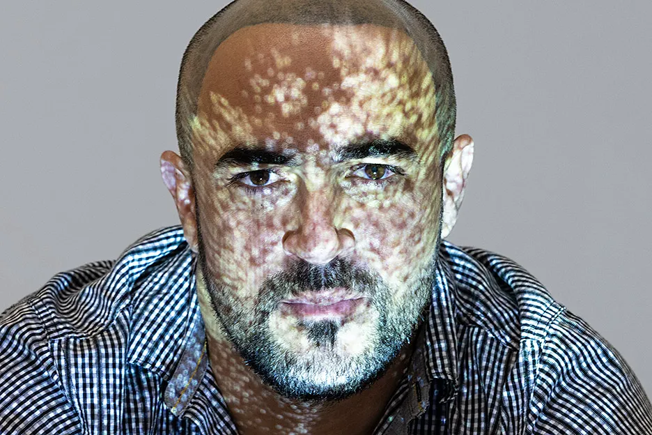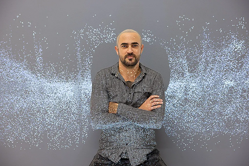 11-29-2023—Miami, FL--- University of Miami fine art grad student, Alian Martinez Rives poses for a portrait with his 0:06:00 min sound video projection of sound waves, called Jomeokee, the “Great Guide”, displayed at the University of Miami Gallery Friday afternoon.