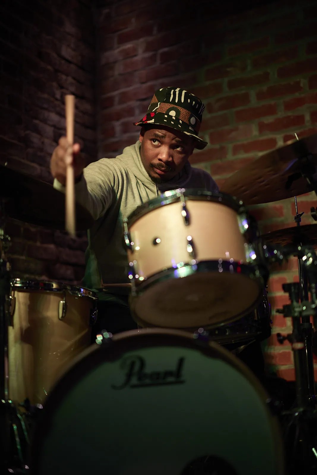 Lumanyano Bizana is the house drummer for the monthly jam sessions at Wally's where students sign up to perform from the New Standards book, hosted by the Berklee's Institute of Jazz and Gender Justice.