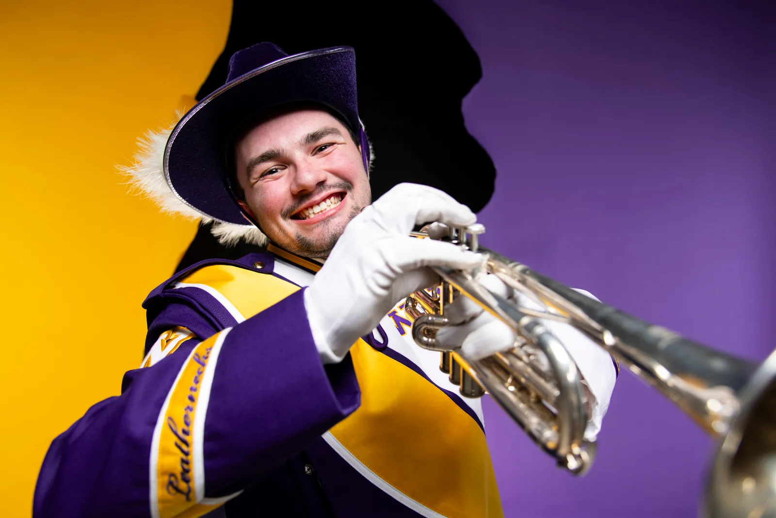 Anthony Tinerella poses for a portrait with his trumpet and in full uniform to commemorate wrapping up his senior year with The Marching Leathernecks.