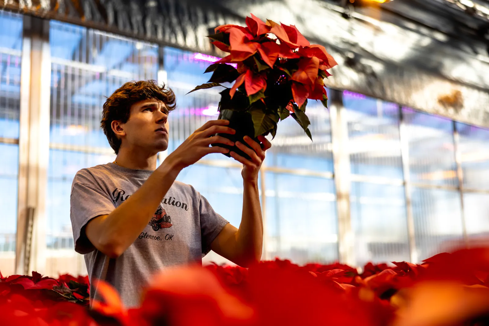 Horticulture students check poinsettia plants for aphids after the Thanksgiving break. Hosted in the Greenhouse Learning Center, 2023 will be the 33rd year for the annual poinsettia sale to support the Department of Horticulture and Landscape Architecture program.