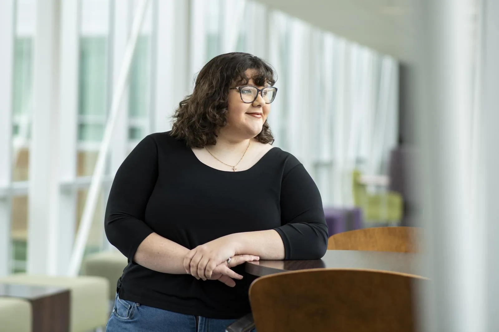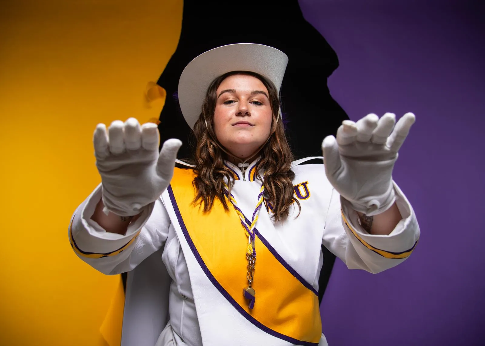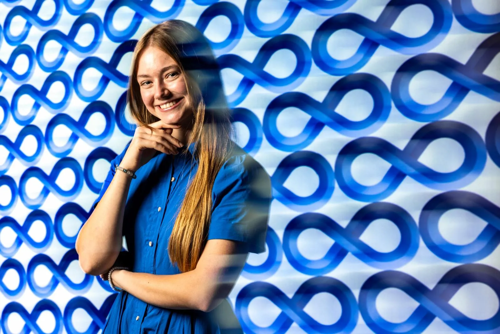 Emmy Peach, UGA student diagnosed with autism as an adult, poses portrait in front of an infinity symbol design representing the broad and varied spectrum of experiences and infinite potential of individuals with autism.