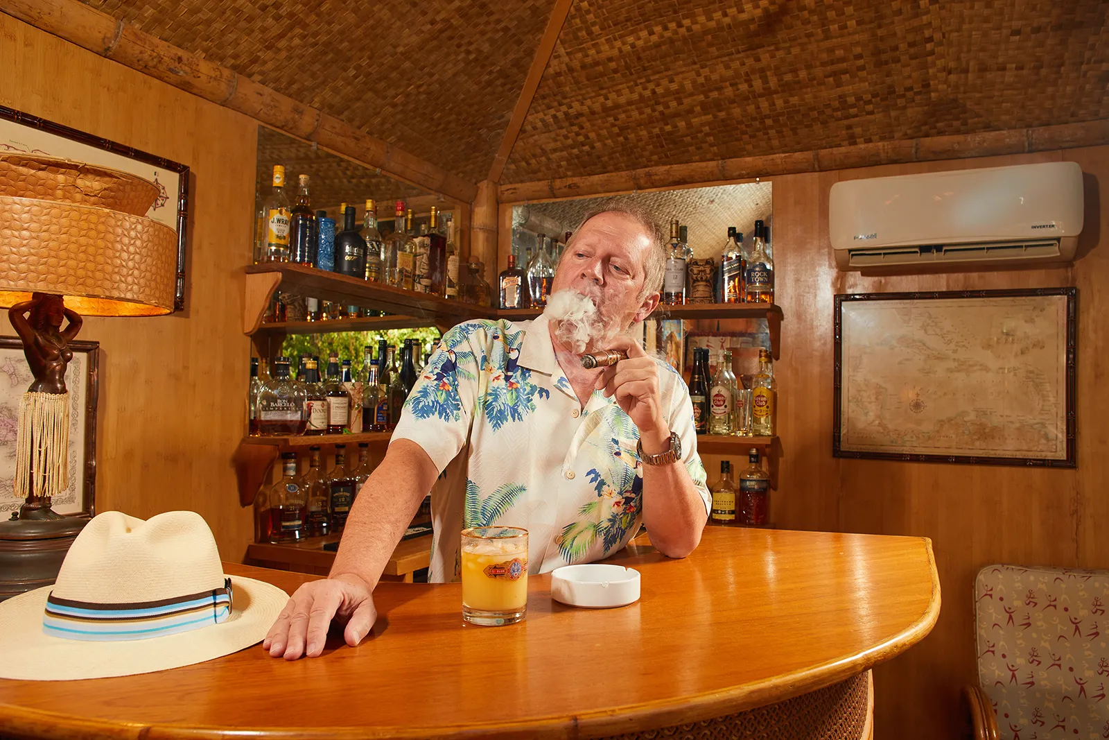 Acting Dean, Tony Henthorne, Ph.D., relaxes in his luxurious home tiki bar after a long day in the office.