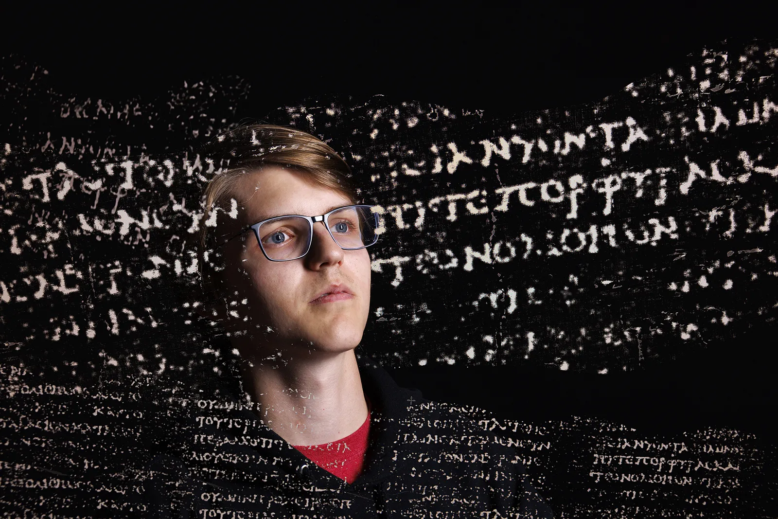 Luke Farritor, a senior in the Jeffrey S. Raikes School of Computer Science and Engineering, recently won a global contest to read the first text inside a carbonized scroll from the ancient Roman city of Herculaneum. That text had been unreadable since the eruption of Mount Vesuvius in A.D. 79. Farritor developed a machine-learning algorithm that detected the Greek word πορϕυρας (purple) on the charred papyrus scroll, which is too delicate to unroll using MRI scans. In this mulitiple exposure, the word πορϕυρας is in the line of text appearing in a line with his eyes to the right.