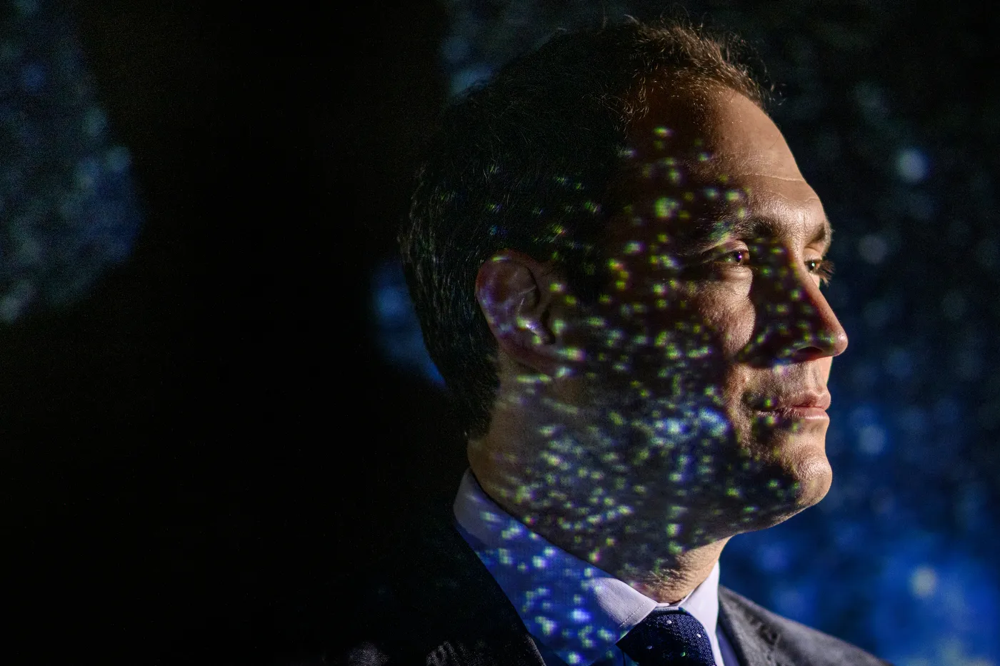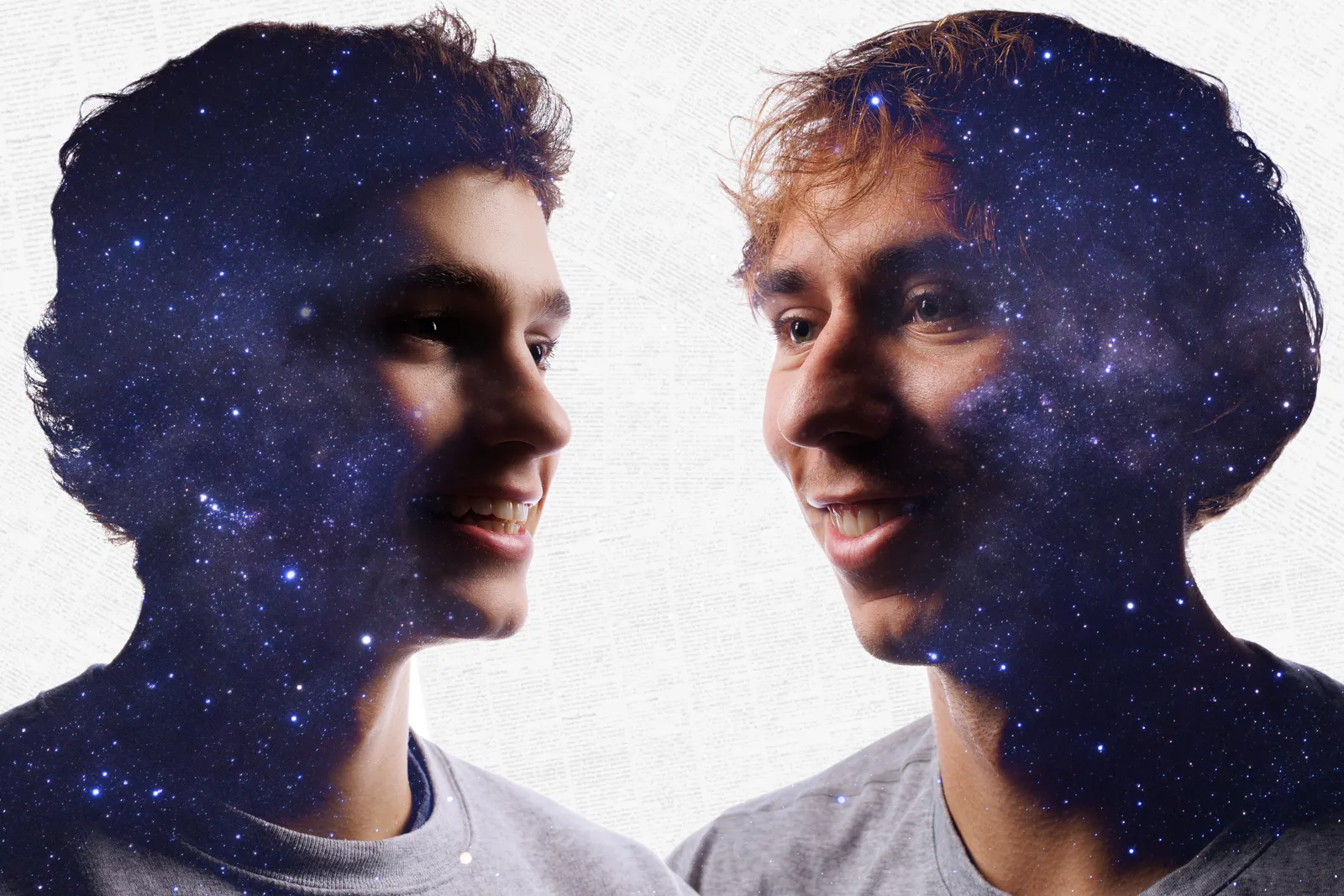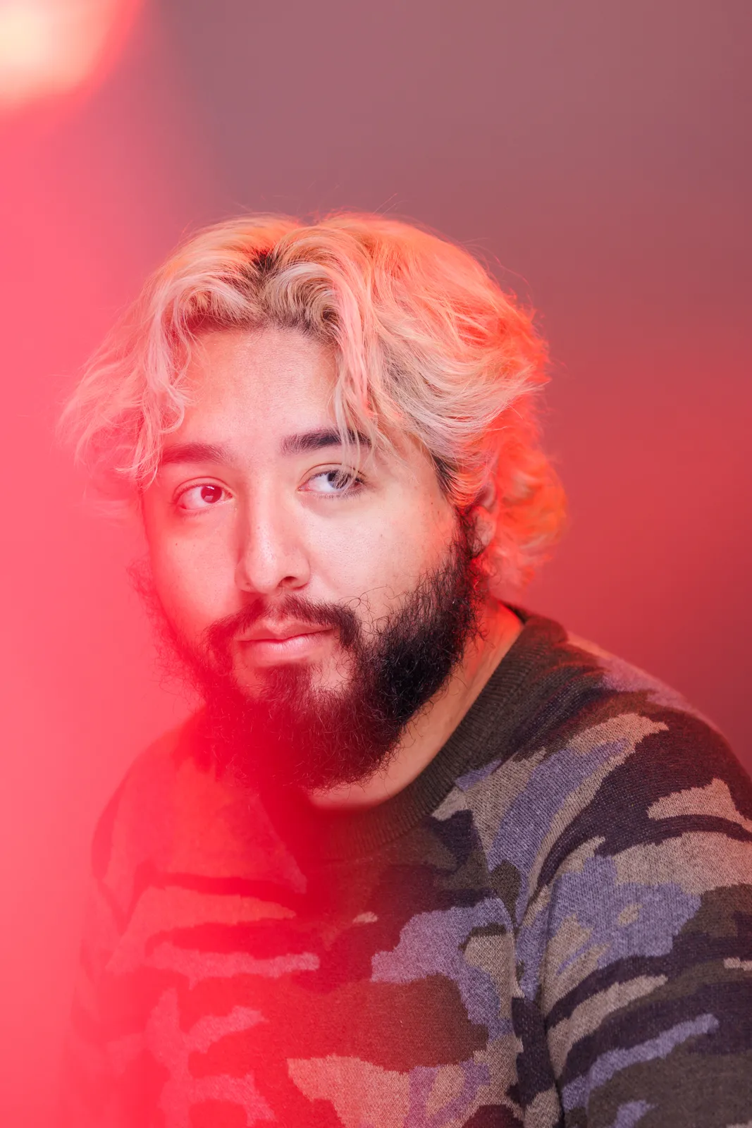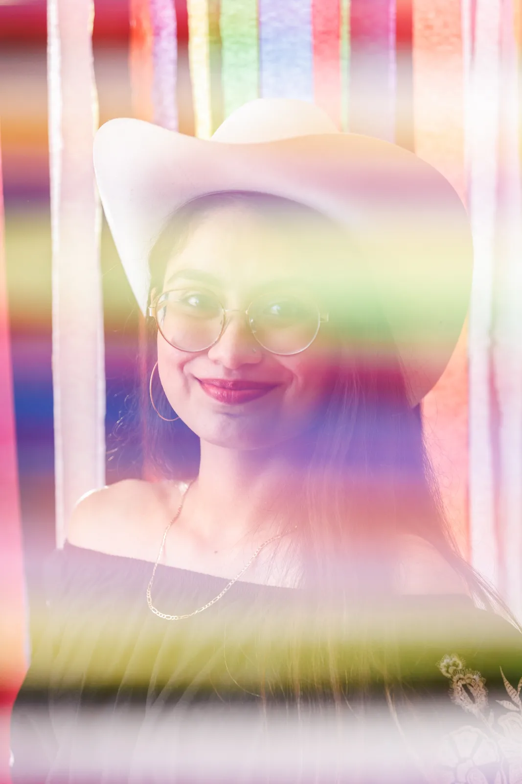In-camera double exposure portrait utilizing the streamers from the background as foreground as well.