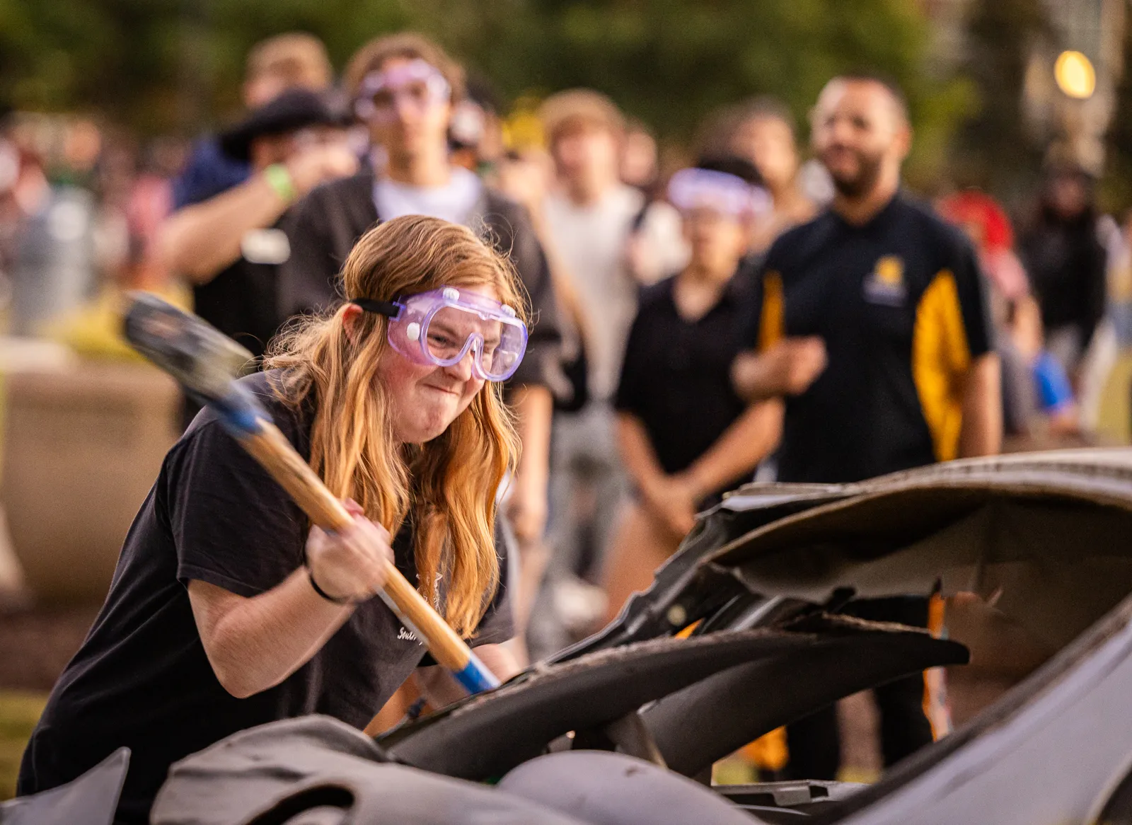 Students wielding sledge hammers take a crack at smashing up a car during the annual Homecoming Kickoff.