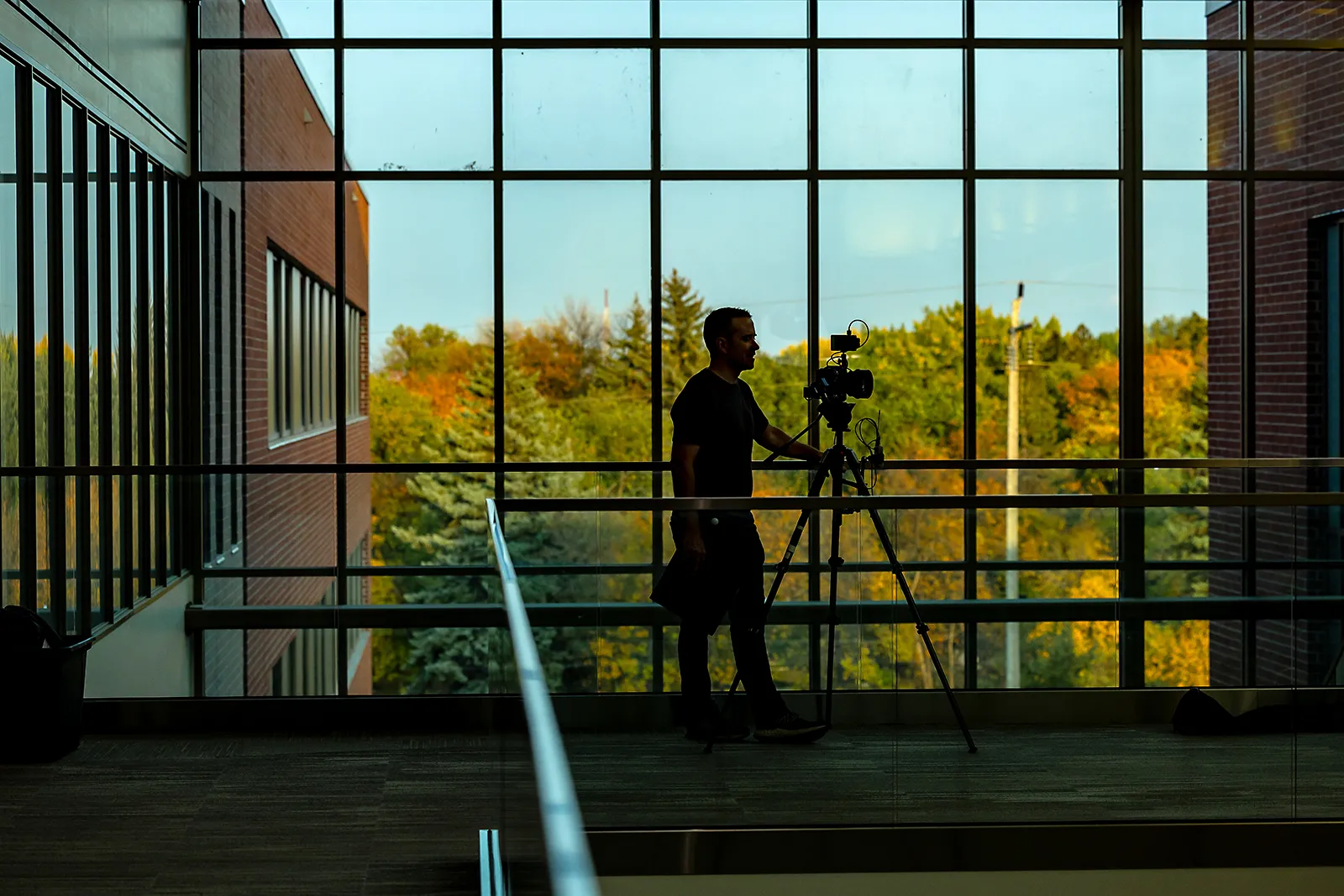 A director interviews a student for a campus commercial at the School of Medicine and Health Sciences.